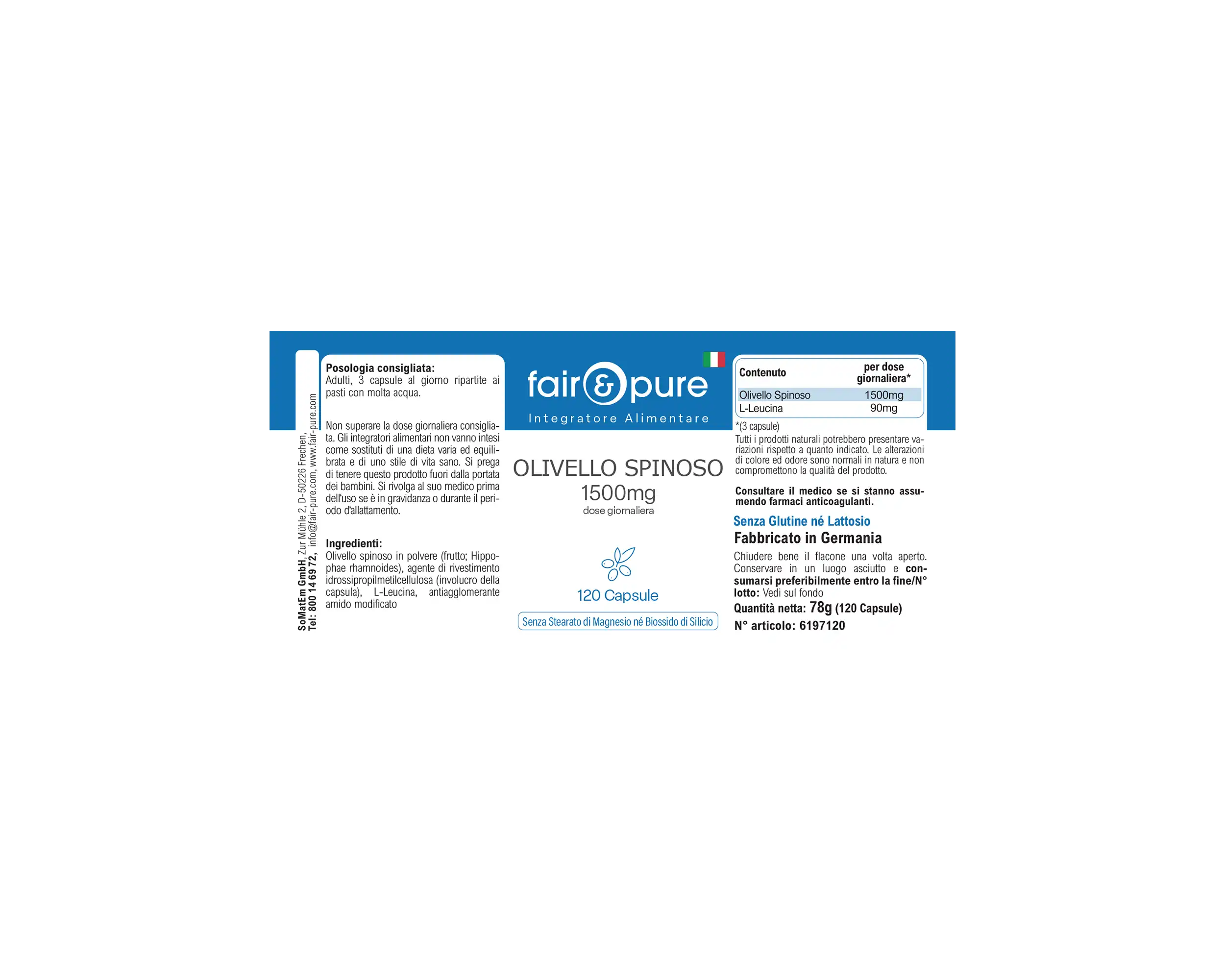 Sea buckthorn powder (fruit; Hippophae rhamnoides L.), glazing agent hydroxypropylmethylcellulose (capsule shell), L-Leucine, Anti-caking agent (modified starch)