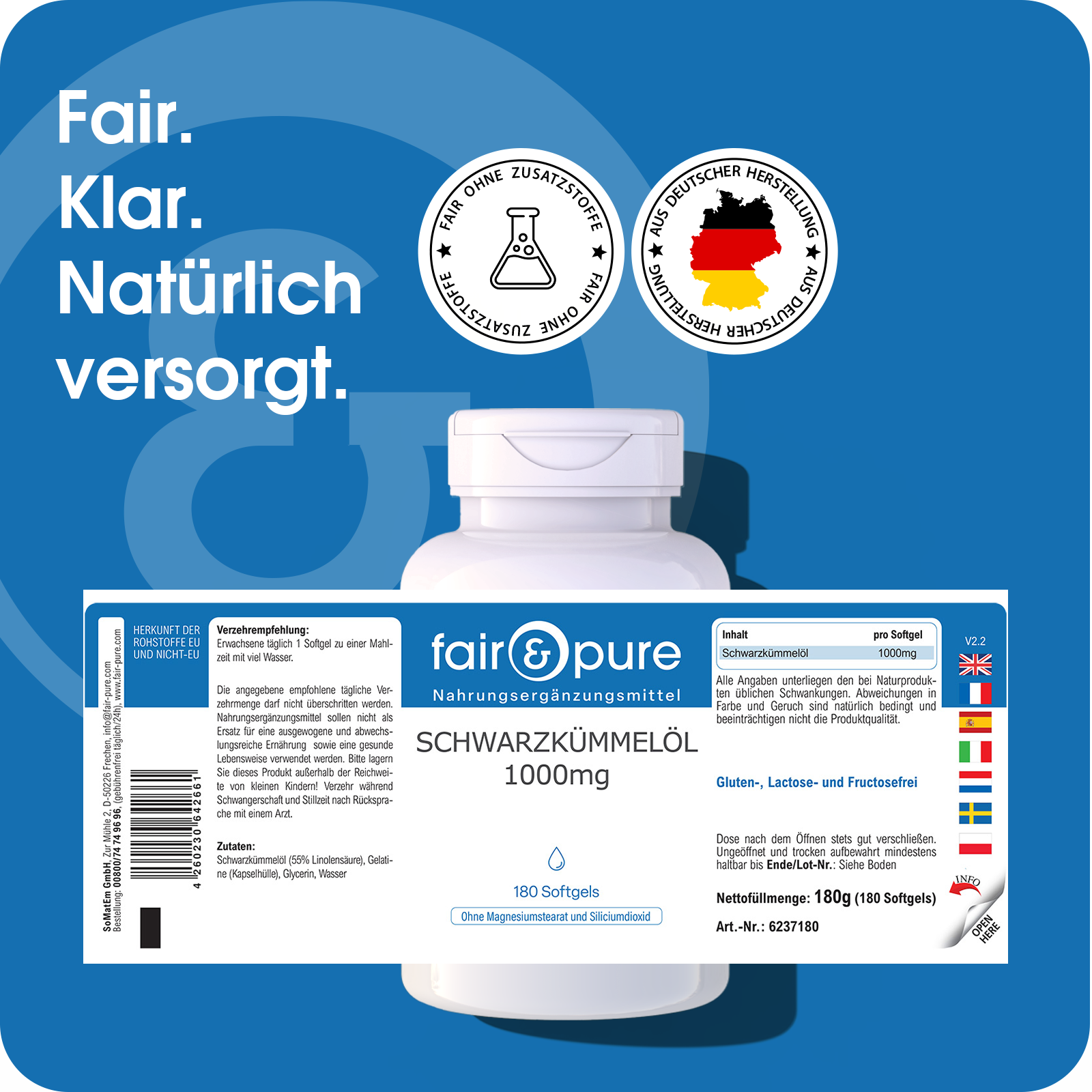 Schwarzkümmelöl 1000mg - 180 Softgels | fair-pure