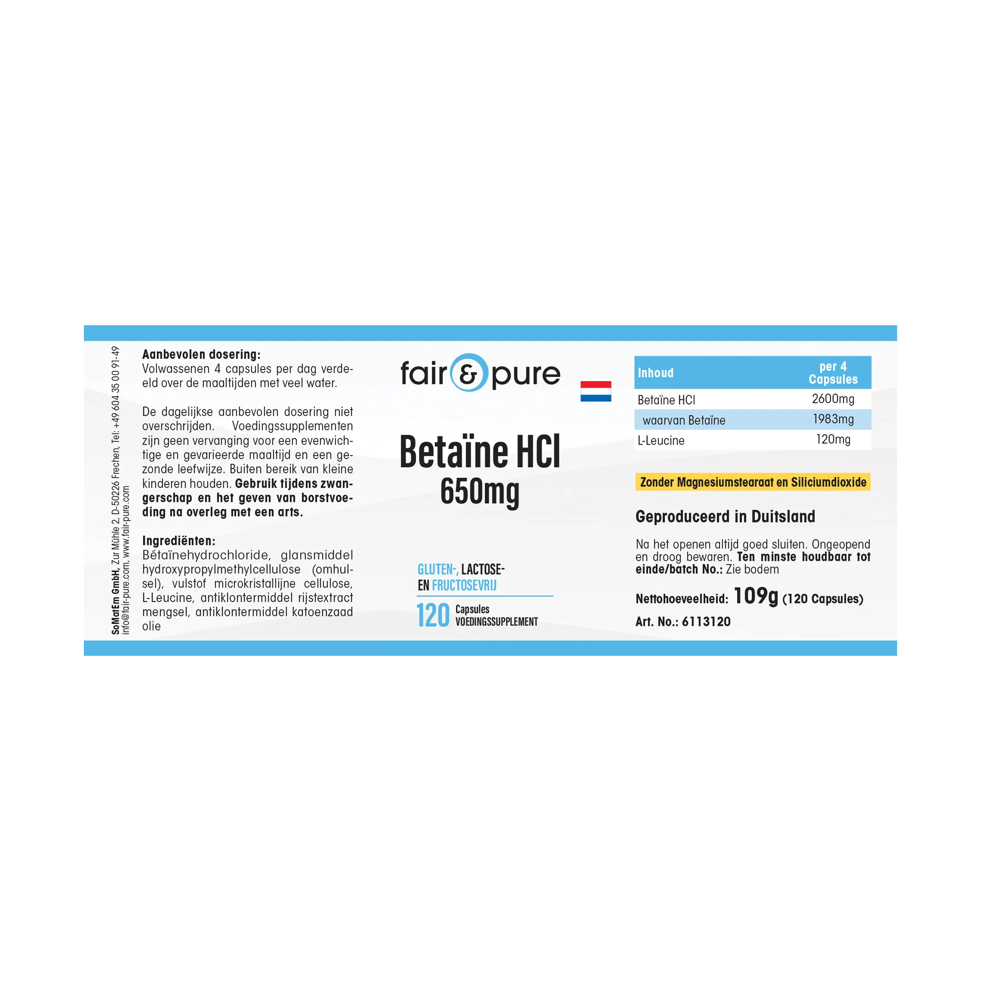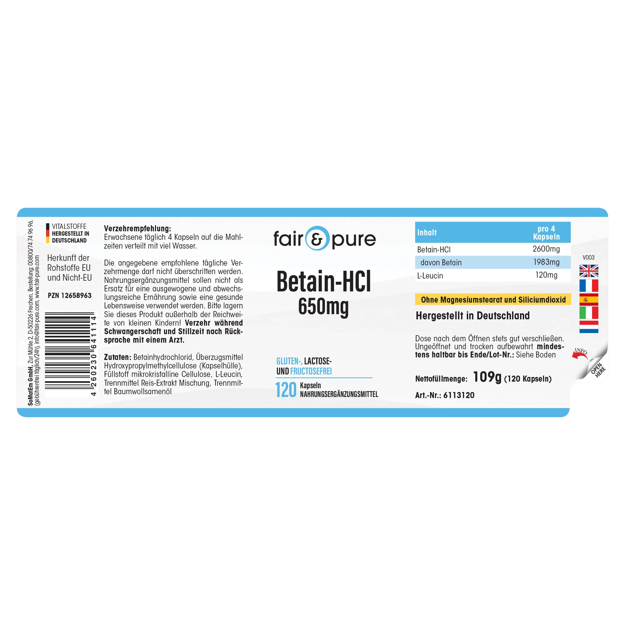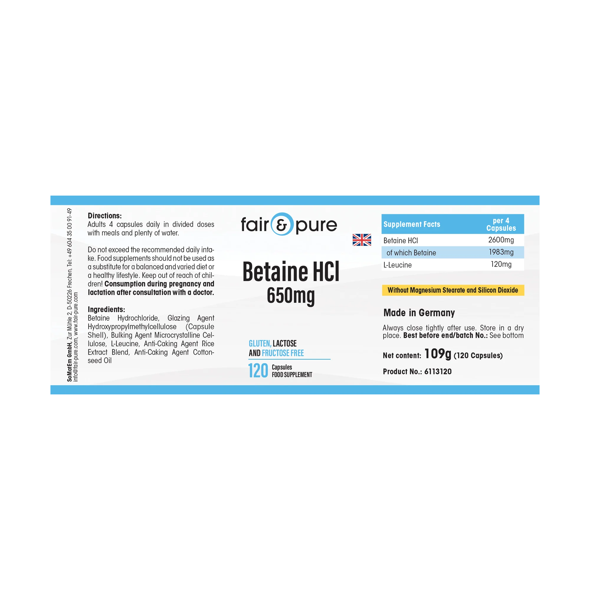 Diese Kapseln enthalten 650 mg Betain Hydrochlorid (HCl) pro Kapsel. Betain ist eine natürliche Verbindung, die in verschiedenen Lebensmitteln wie Rüben vorkommt und häufig als Nahrungsergänzungsmittel verwendet wird, um die Verdauung zu unterstützen.