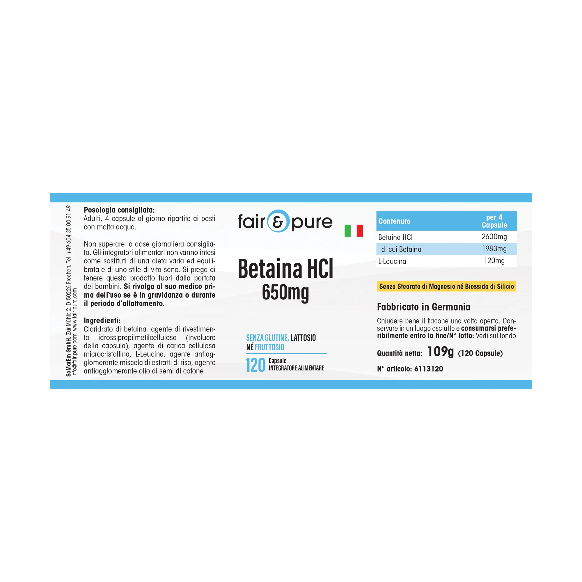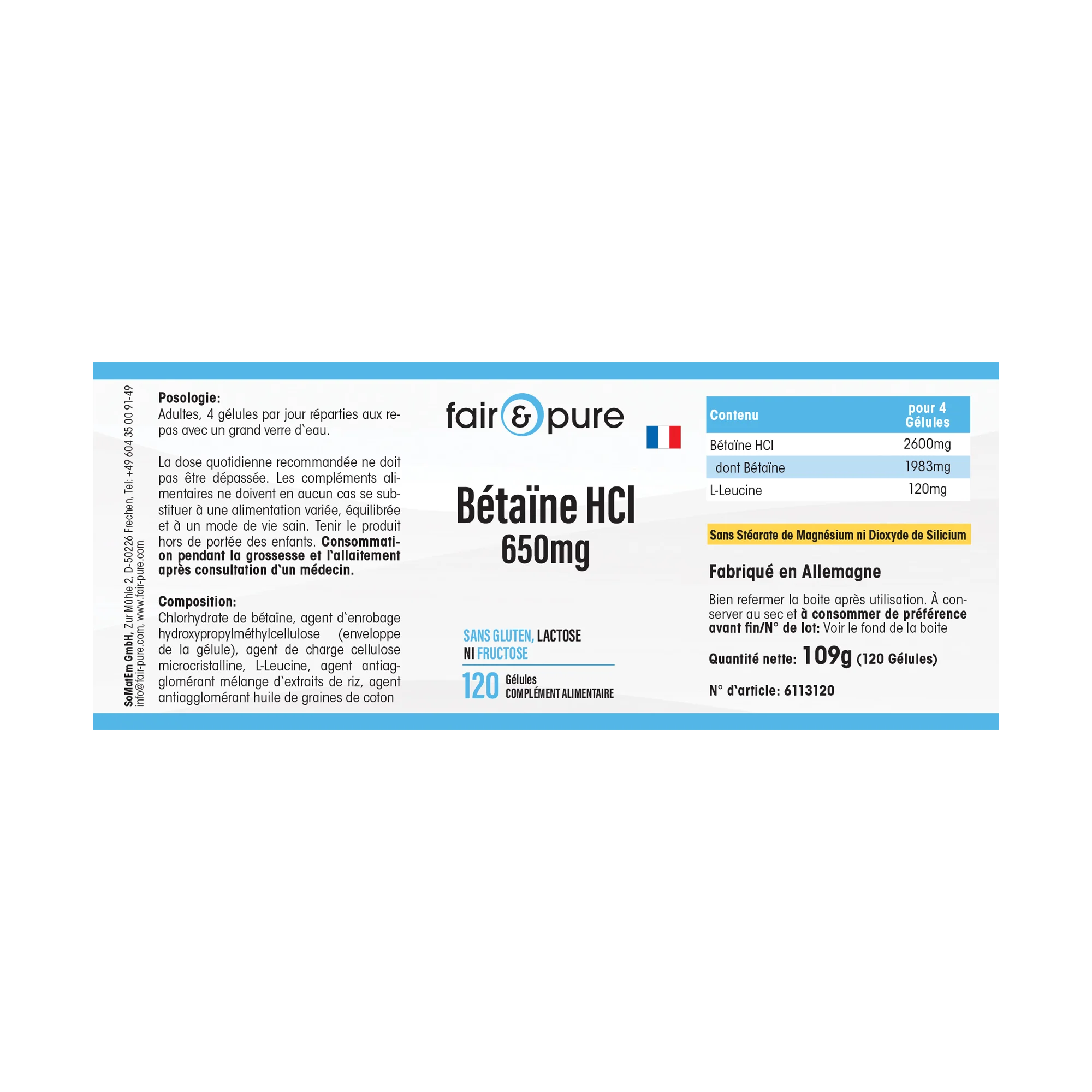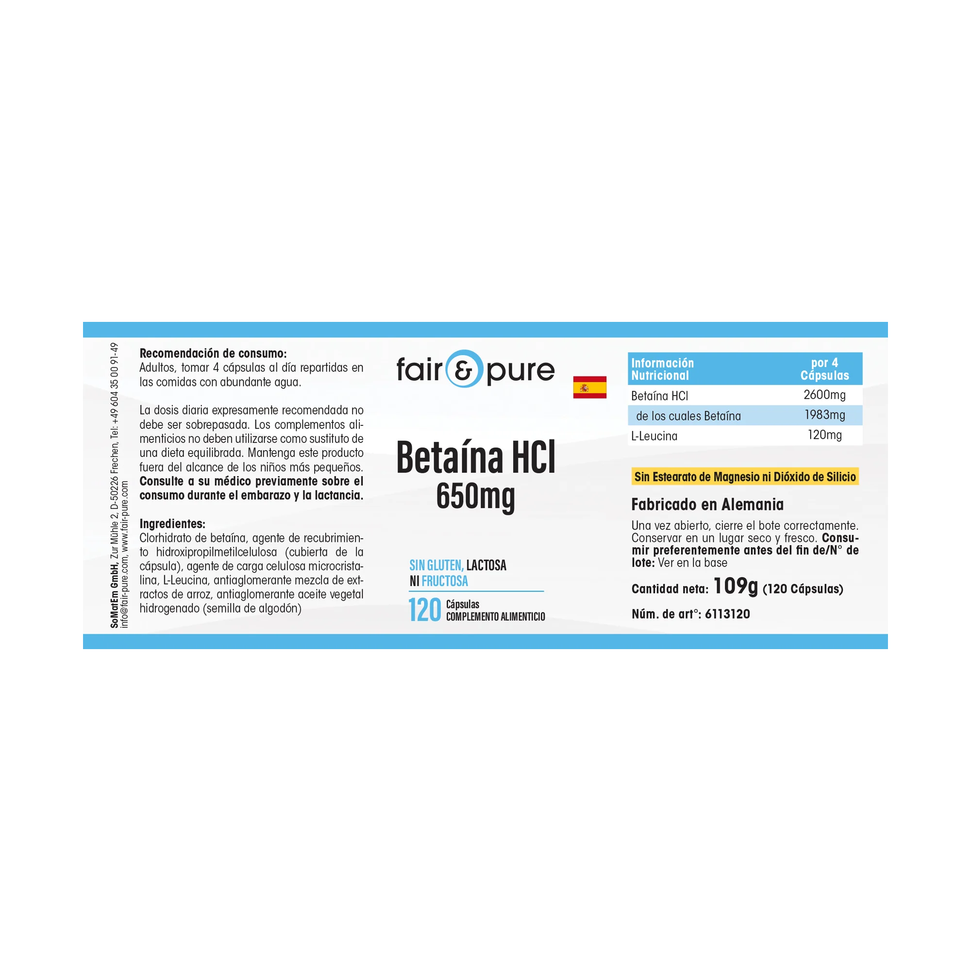 Diese Kapseln enthalten 650 mg Betain Hydrochlorid (HCl) pro Kapsel. Betain ist eine natürliche Verbindung, die in verschiedenen Lebensmitteln wie Rüben vorkommt und häufig als Nahrungsergänzungsmittel verwendet wird, um die Verdauung zu unterstützen.