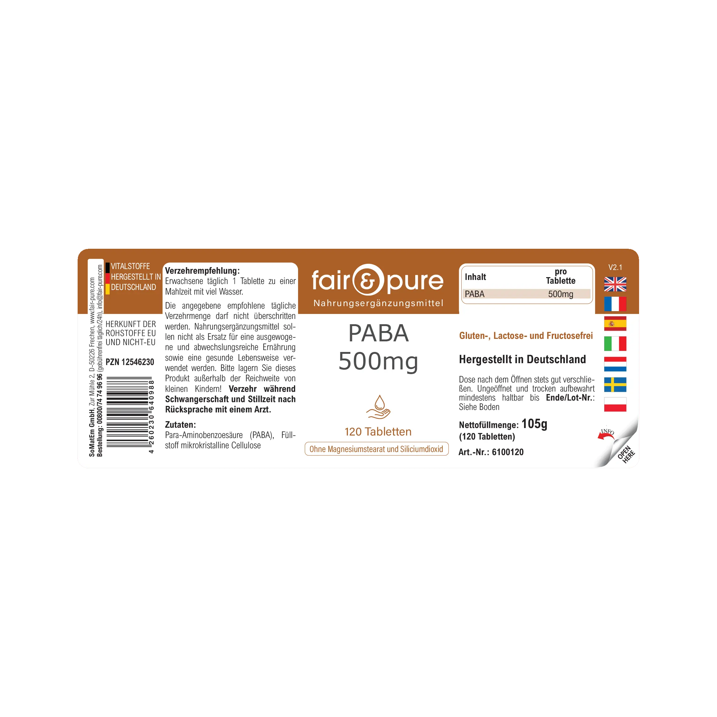 Produktinformationen "PABA 500 mg - 120 Tabletten - Para-Aminobenzoesäure - Vitamin B10 | fair & pure"