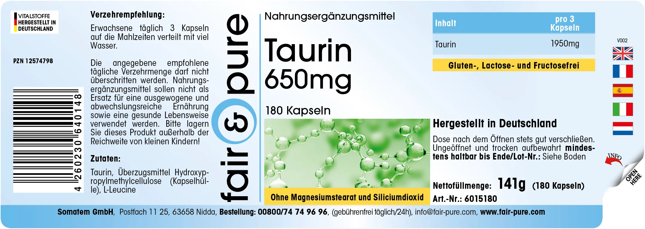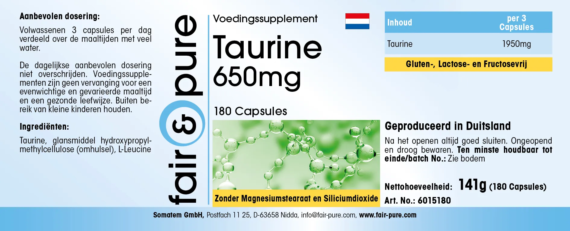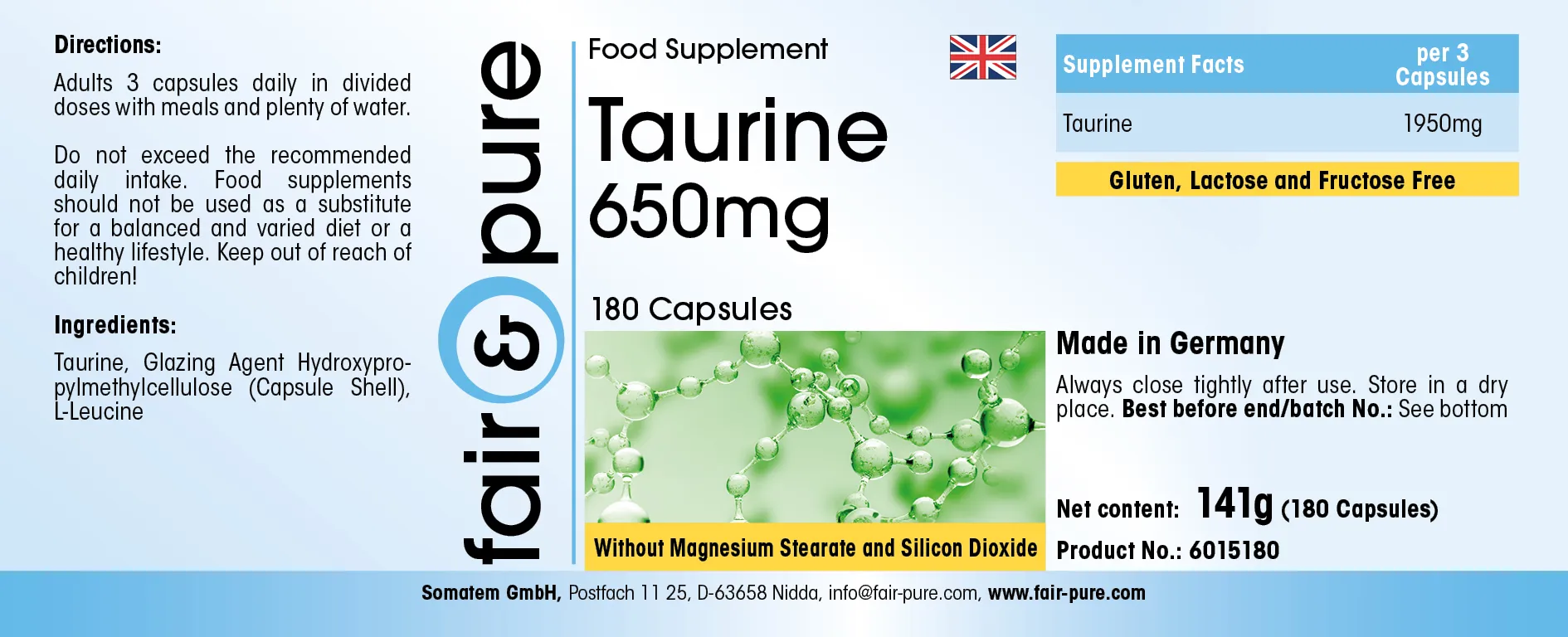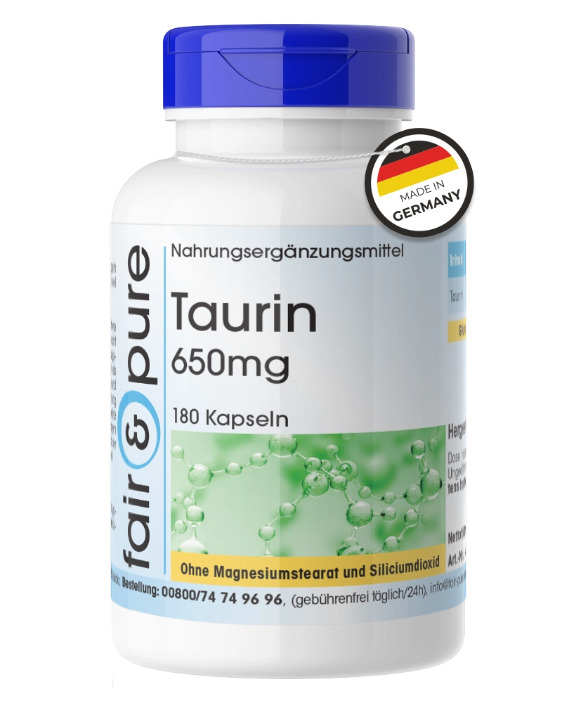 Die Taurin 650mg Kapseln enthalten Taurin, eine schwefelhaltige Aminosäure, die im Körper in verschiedenen biologischen Prozessen eine Rolle spielt. Es ist in vielen Geweben des Körpers vorhanden und wird auch über die Ernährung aufgenommen.