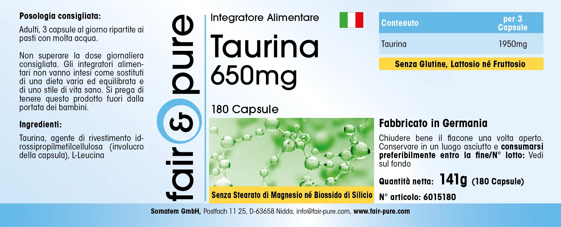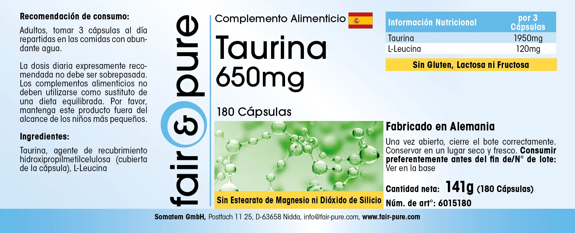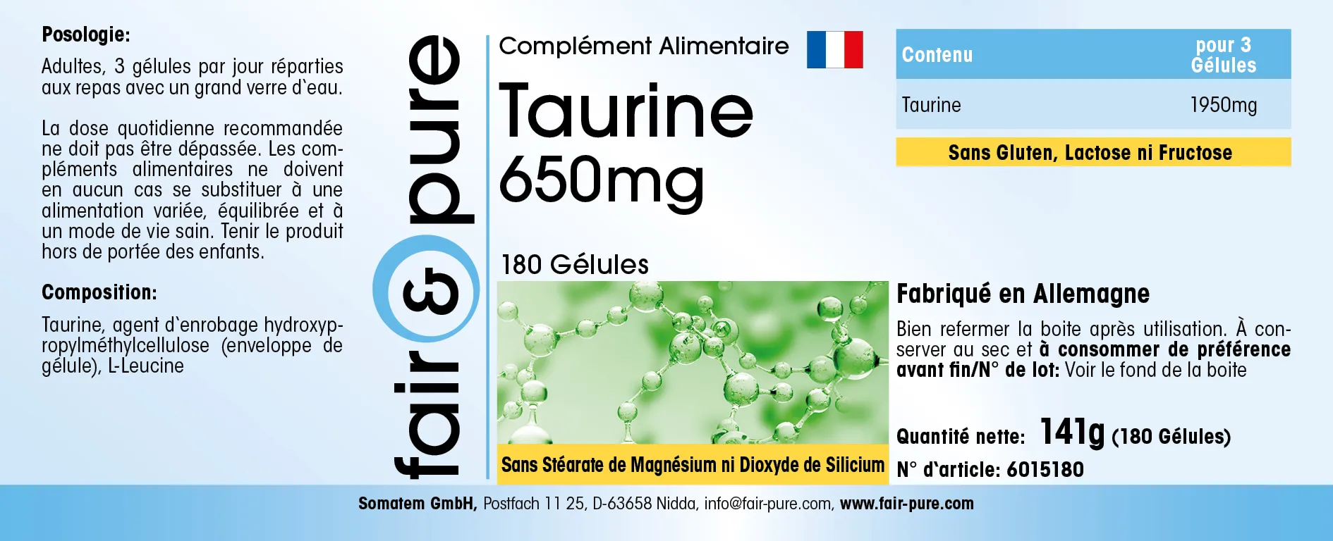 Die Taurin 650mg Kapseln enthalten Taurin, eine schwefelhaltige Aminosäure, die im Körper in verschiedenen biologischen Prozessen eine Rolle spielt. Es ist in vielen Geweben des Körpers vorhanden und wird auch über die Ernährung aufgenommen.