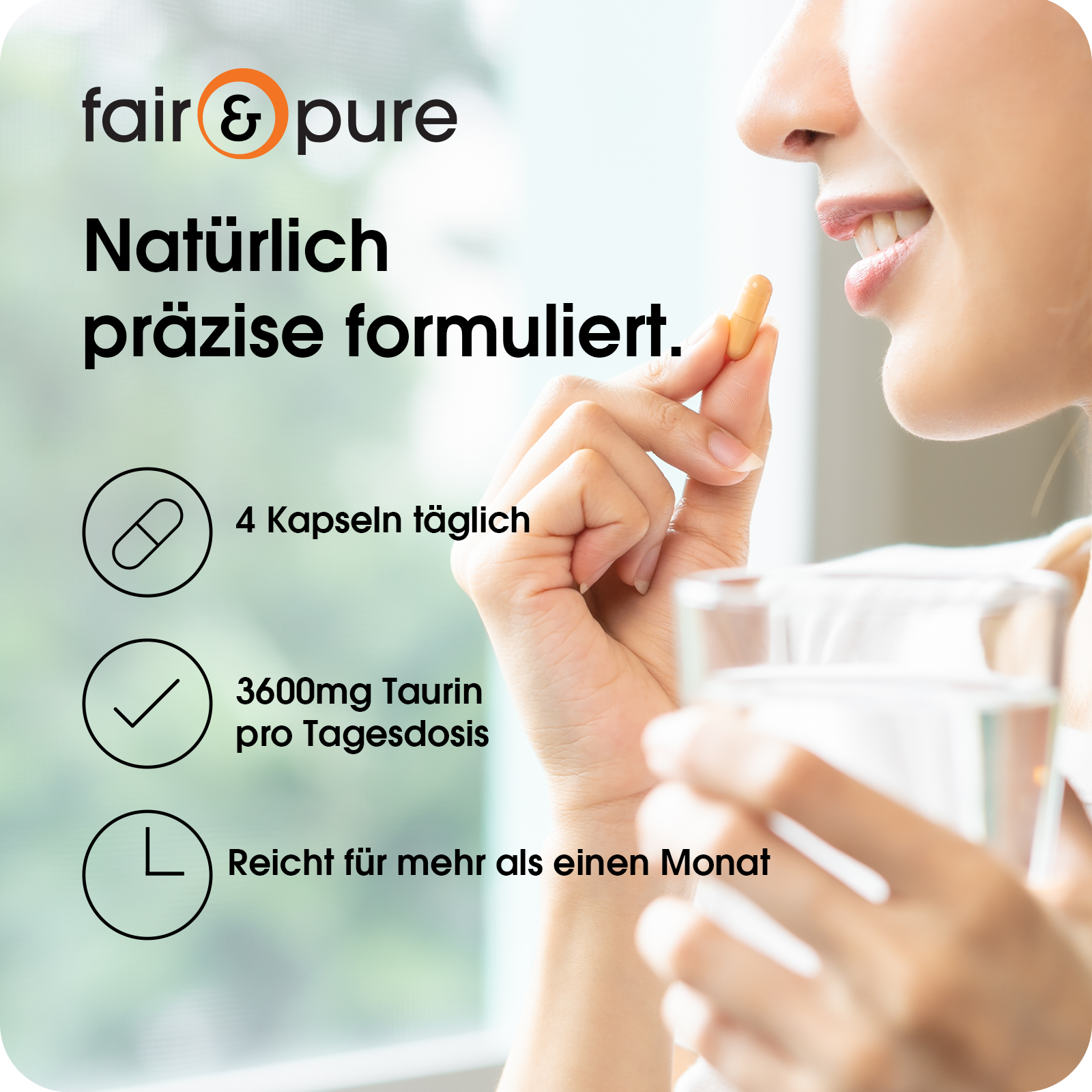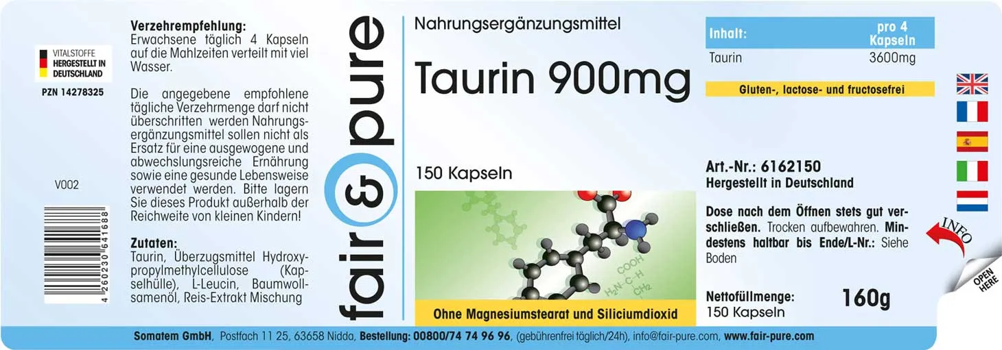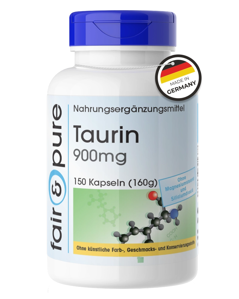 Die Taurin 900mg Kapseln enthalten Taurin, eine schwefelhaltige Aminosäure, die eine wichtige Rolle im Körper spielt. Taurin kommt natürlicherweise in verschiedenen Geweben vor und kann auch über die Nahrung aufgenommen werden.