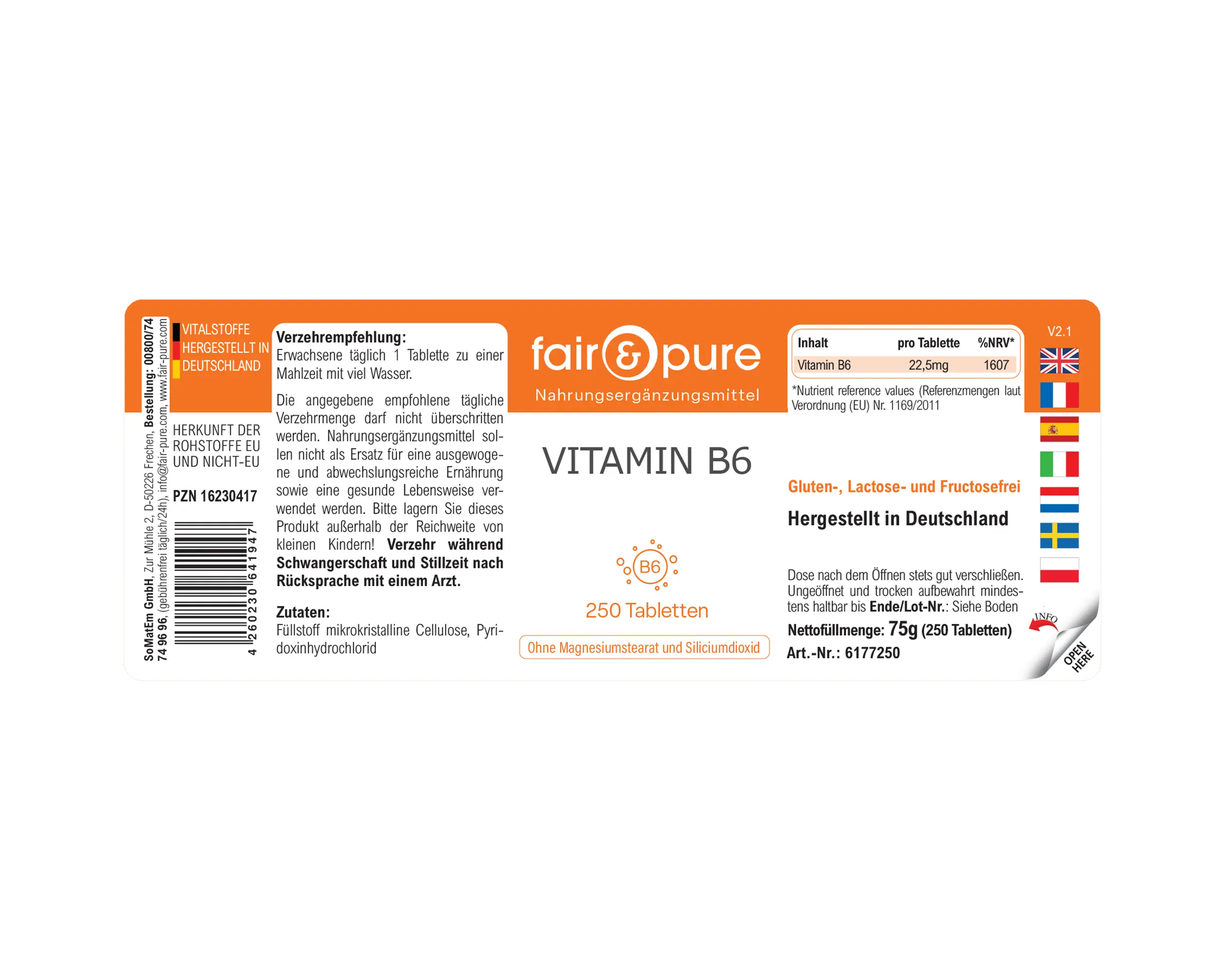 Gutes Einzelnes vitamin. Bei zusammenstellungen mehrerer B-Vitamine (B vitaminkomplex) sind oft nicht erwünschte Bestandteile drin (Trennmittel, billige minderwertige schlecht aufnehmbare Folsäure anstatt gutem Folat, unnütze Benzoesäure und vieles mehr). Besser so wie hier ist es nur den Wirkstoff mit Cellulose zu haben. B6 hilft auch (mit anderen Vitaminen) bei trockener Haut und trockenen Augen, unterstützt histaminabbau, Eiweißstoffwechsel usw. Die Dosierung hier kann auch für längere Dauer eingesetzt werden. Damit B6 akiviert wird benötigt es B2 (Riboflavin), ich z.B. habe einfaches Riboflavin als Pulver (ca. 20mg auf den joghurt und passt)