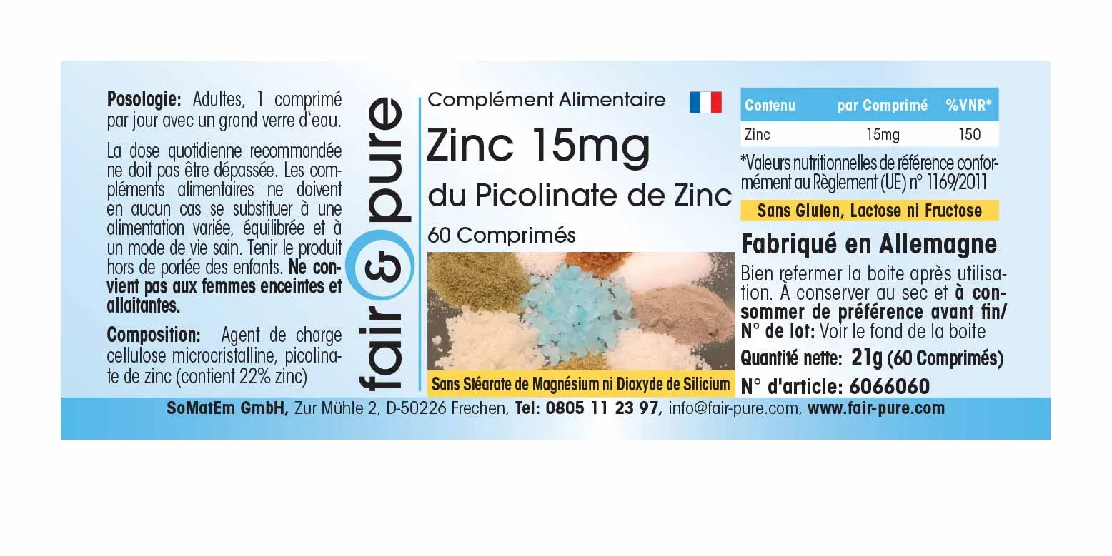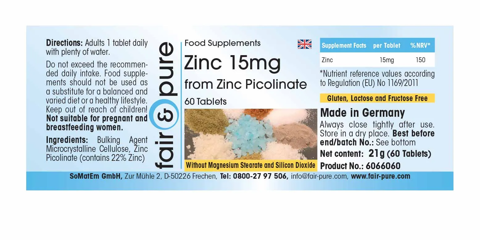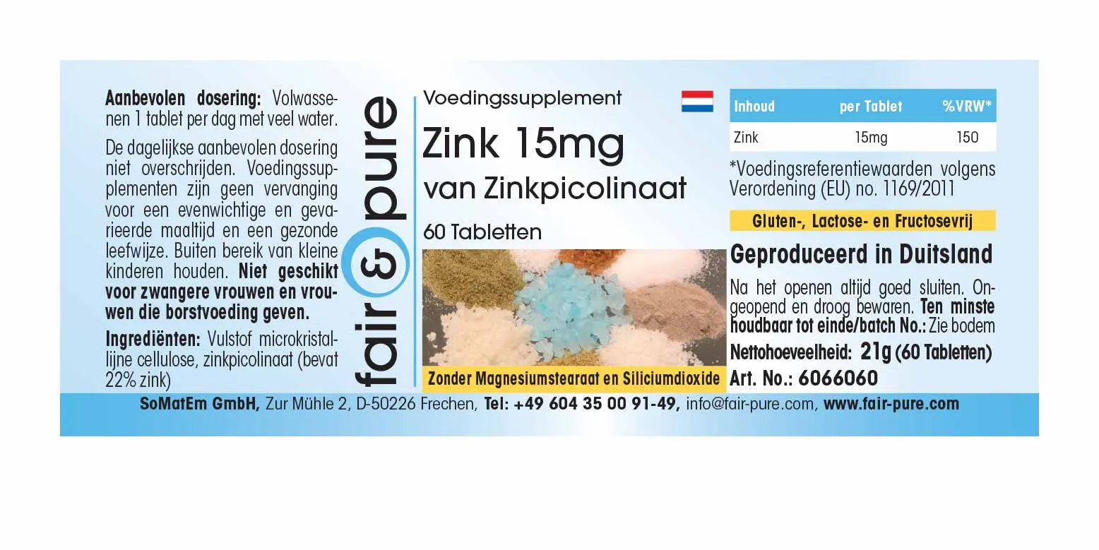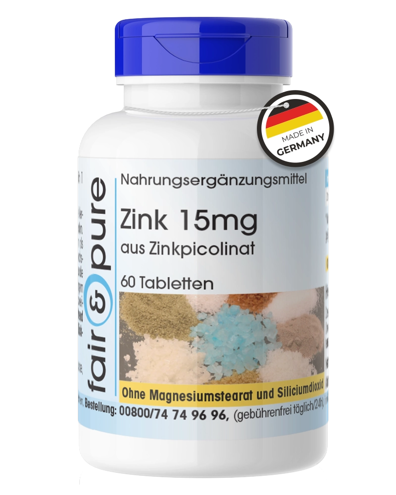 Diese Tabletten enthalten 15 mg Zink pro Tablette in einer gut verfügbaren Form. Zink ist ein wichtiges Spurenelement, das natürlicherweise in Lebensmitteln wie Fleisch, Nüssen und Hülsenfrüchten vorkommt.