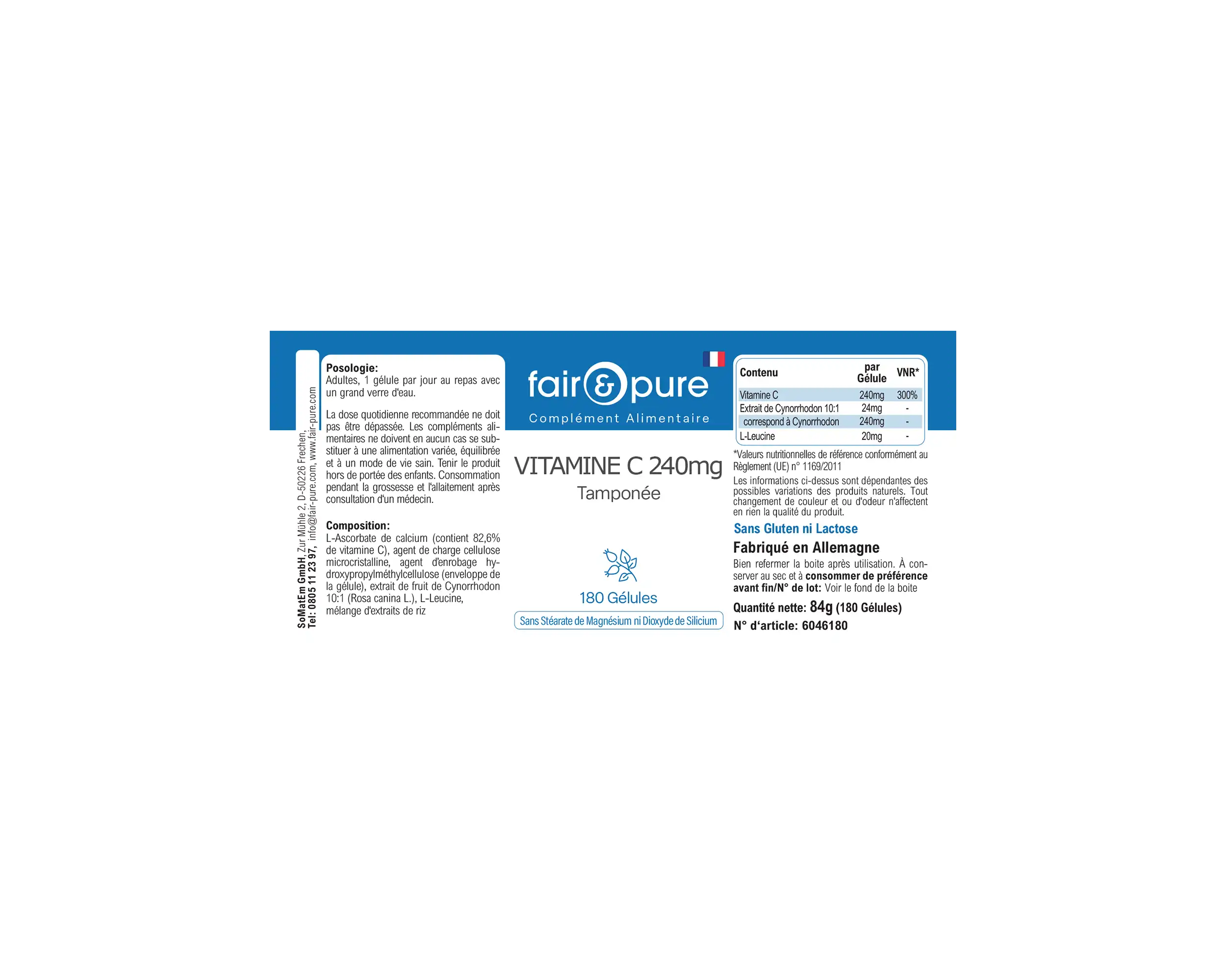 L-Ascorbato de calcio (contiene un 82,6% de vitamina C), agente de carga celulosa microcristalina, agente de recubrimiento hidroxipropilmetilcelulosa (cubierta de la cápsula), extracto de escaramujo 10:1 (Rosa canina L.), L-Leucina, mezcla de extractos de arroz
