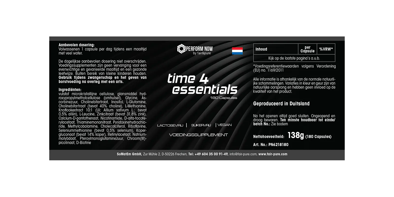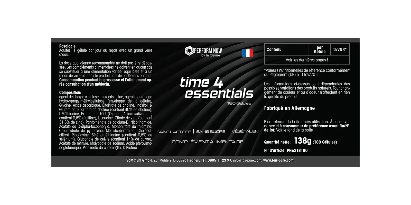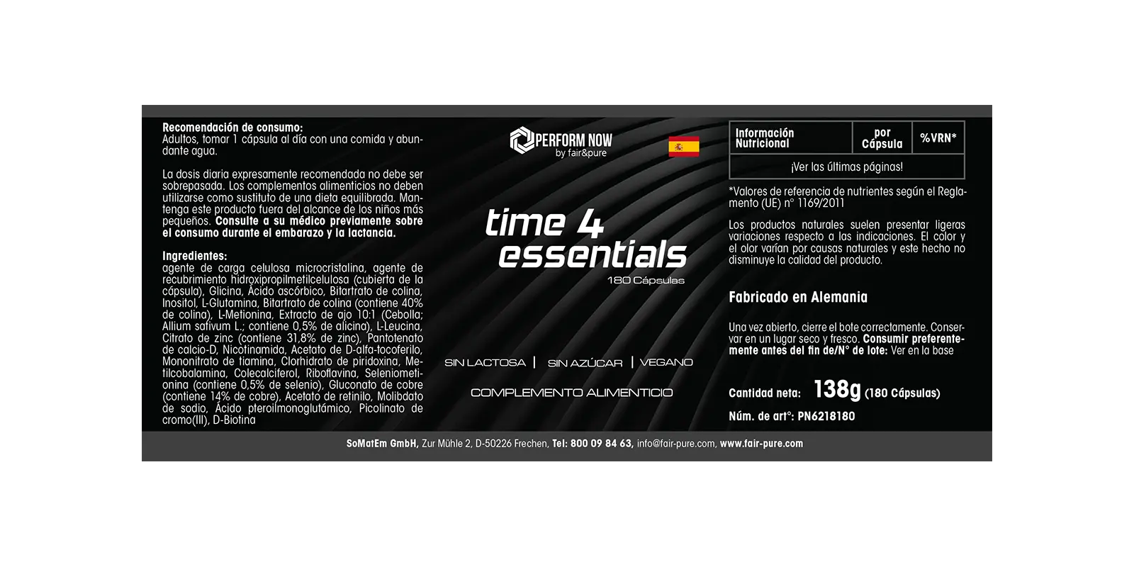 Time 4 Essentials de Perform Now by fair&pure es una fórmula completa que combina vitaminas, minerales, aminoácidos y extractos de plantas. Las cápsulas son veganas, sin lactosa y sin azúcar, ideales para el uso diario.