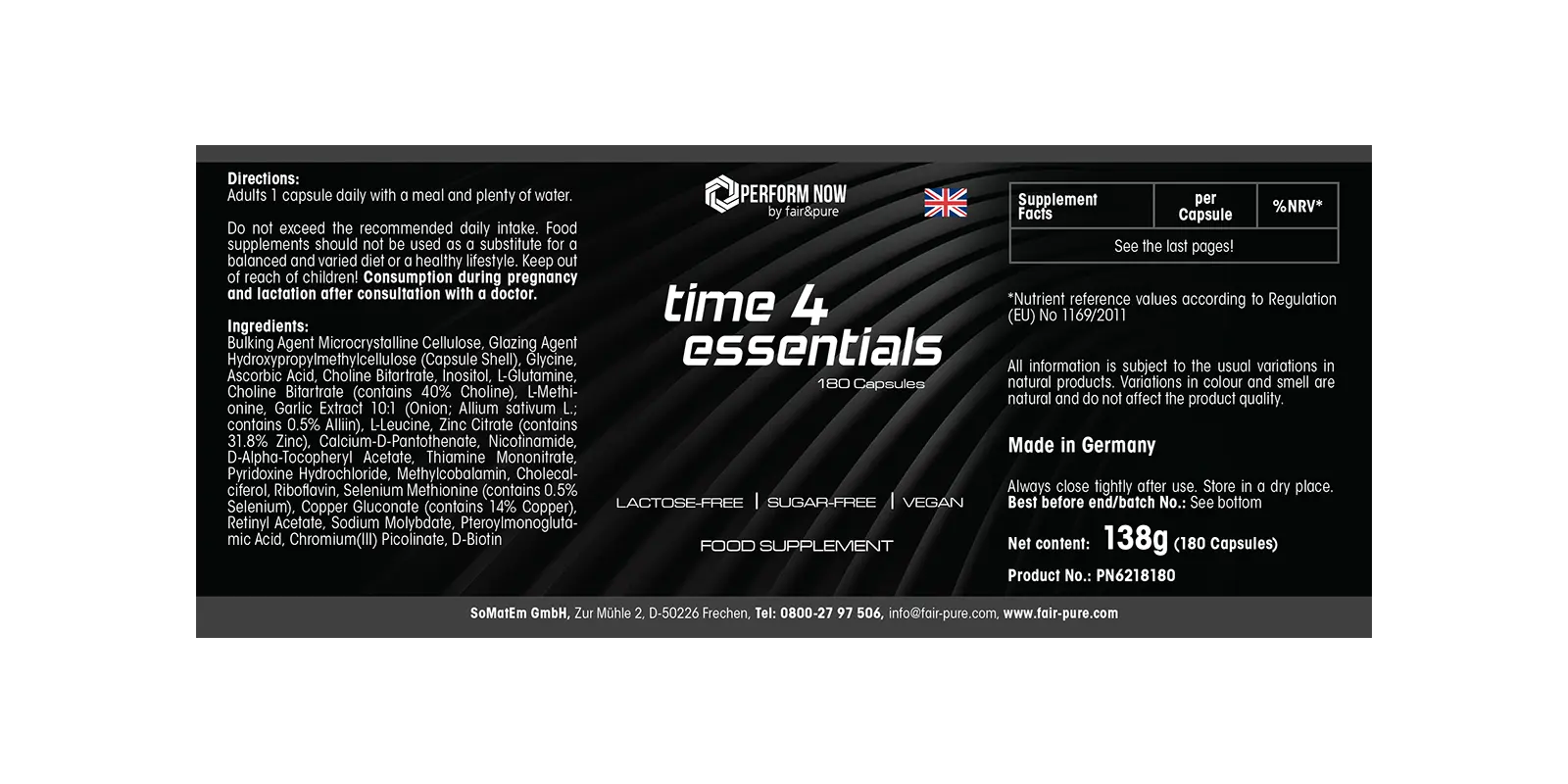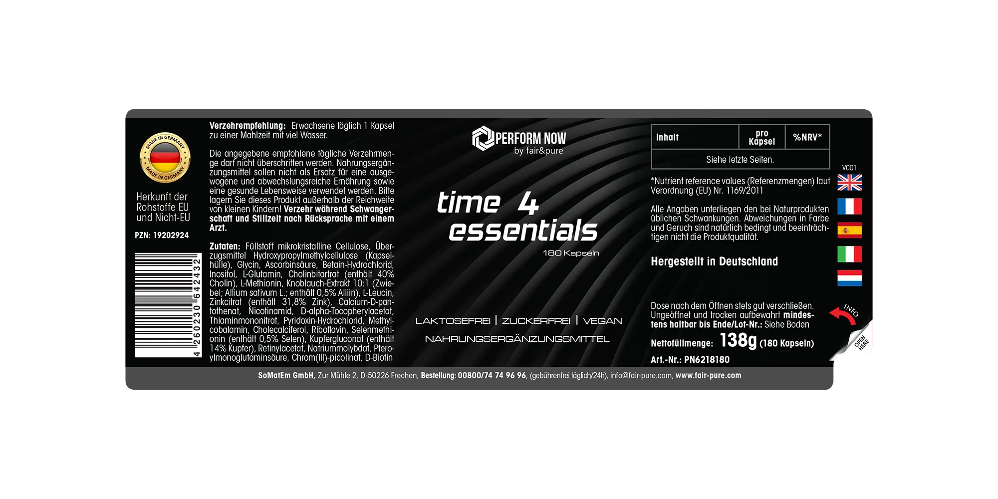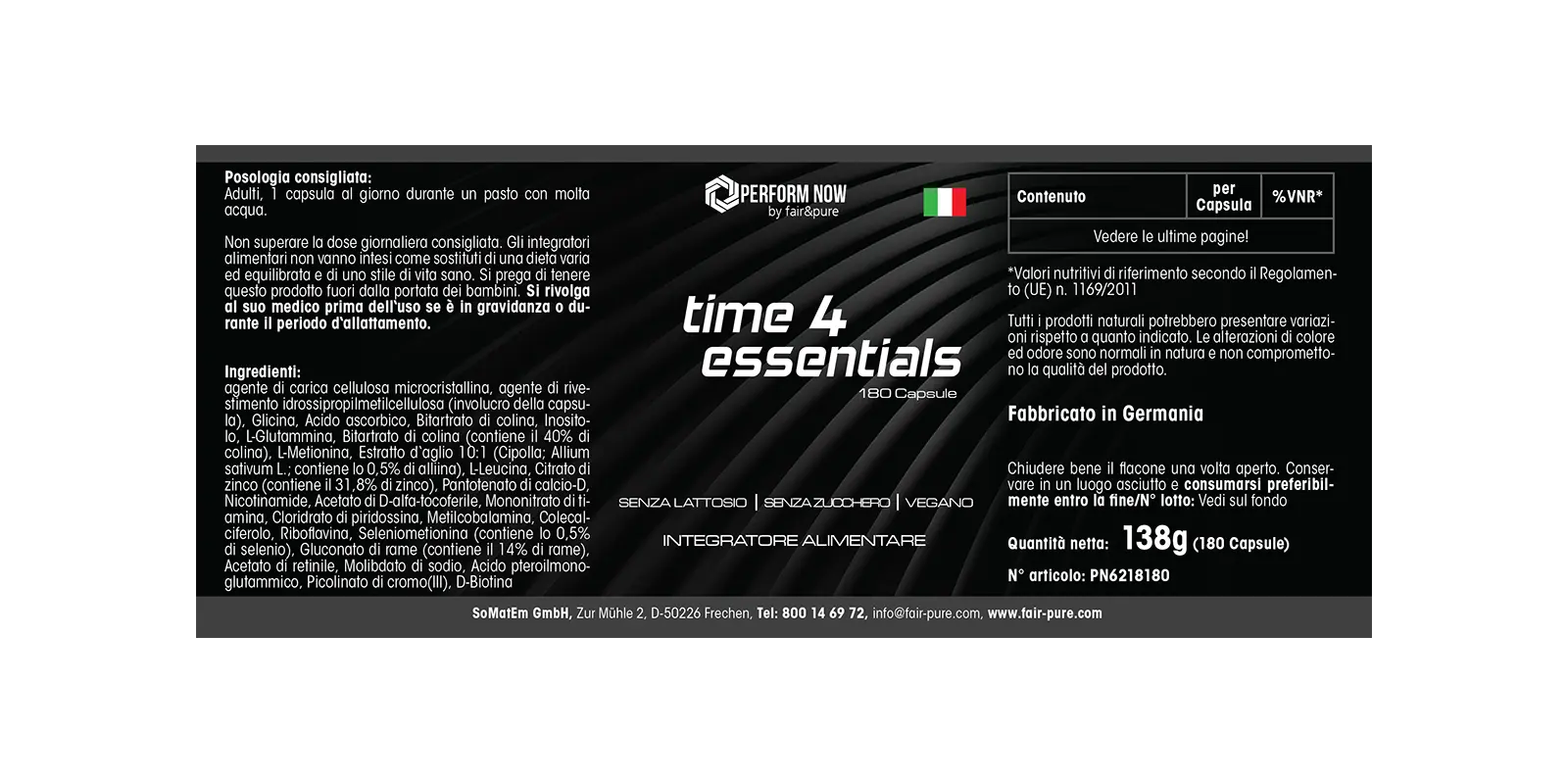 Time 4 Essentials de Perform Now by fair&pure es una fórmula completa que combina vitaminas, minerales, aminoácidos y extractos de plantas. Las cápsulas son veganas, sin lactosa y sin azúcar, ideales para el uso diario.