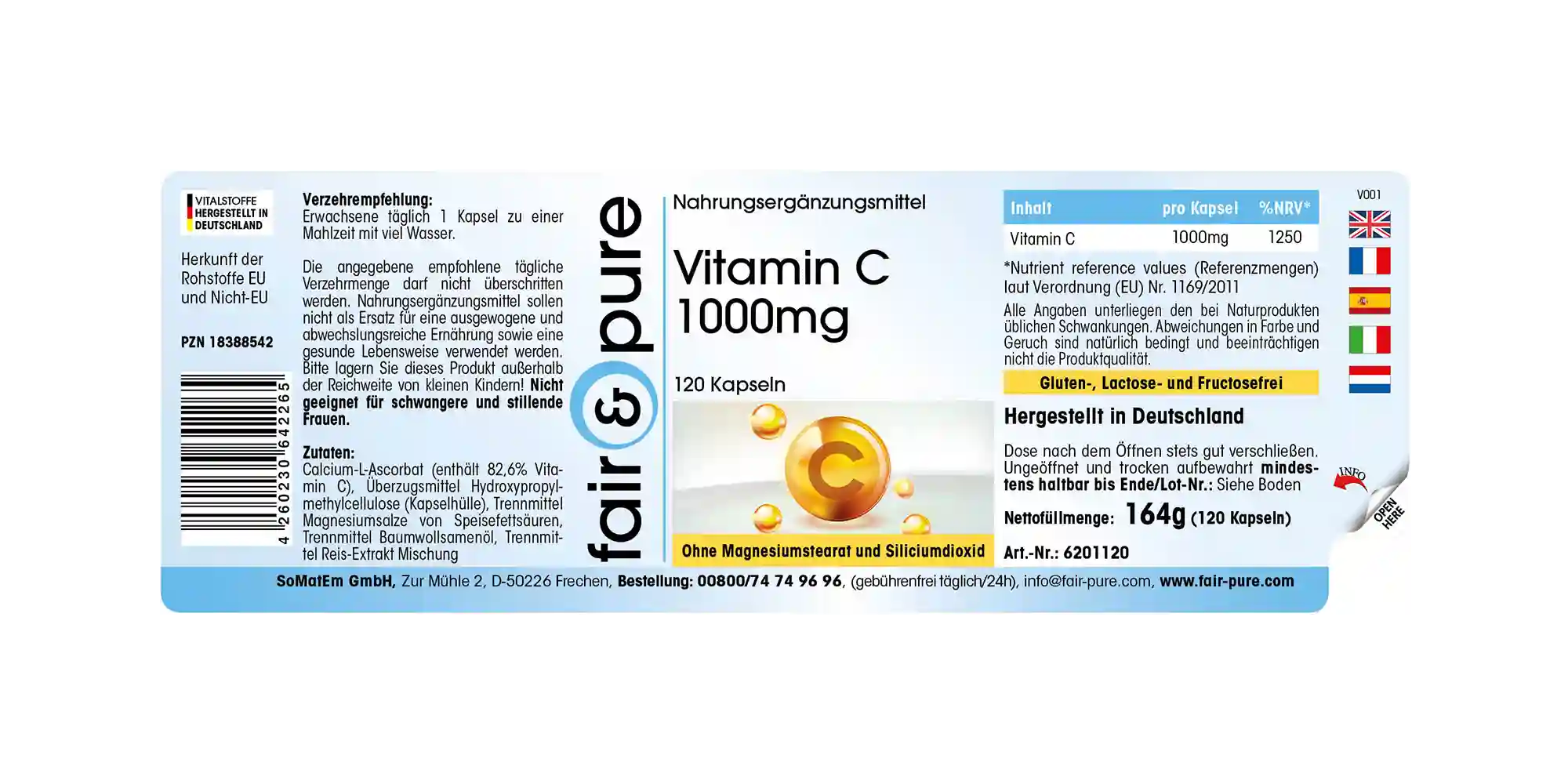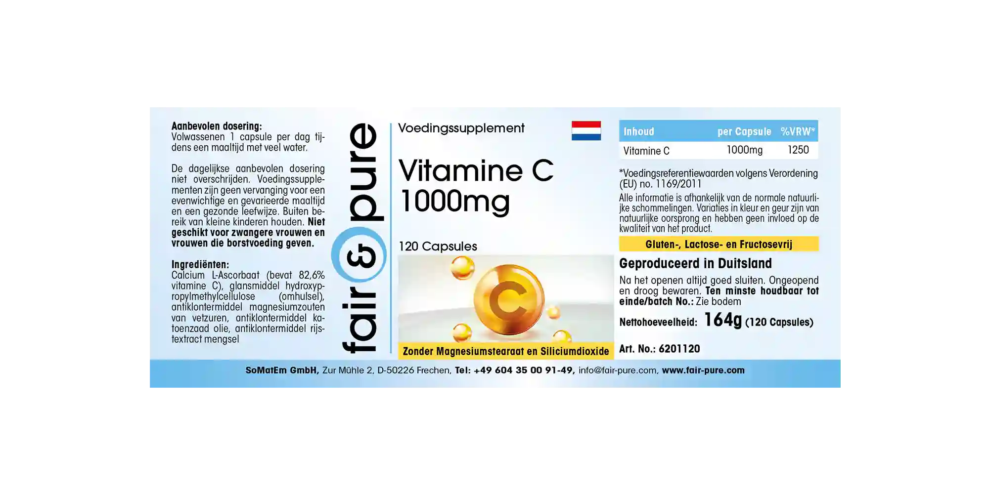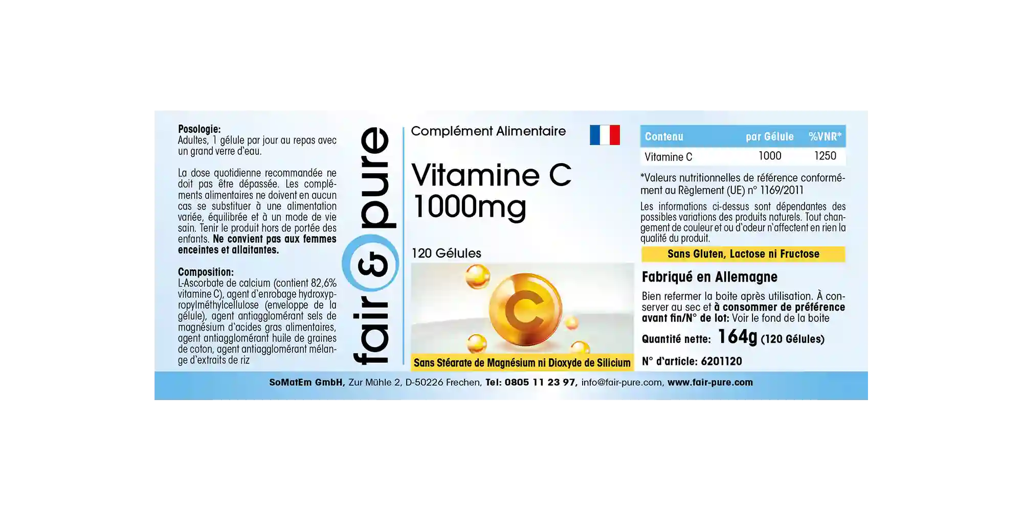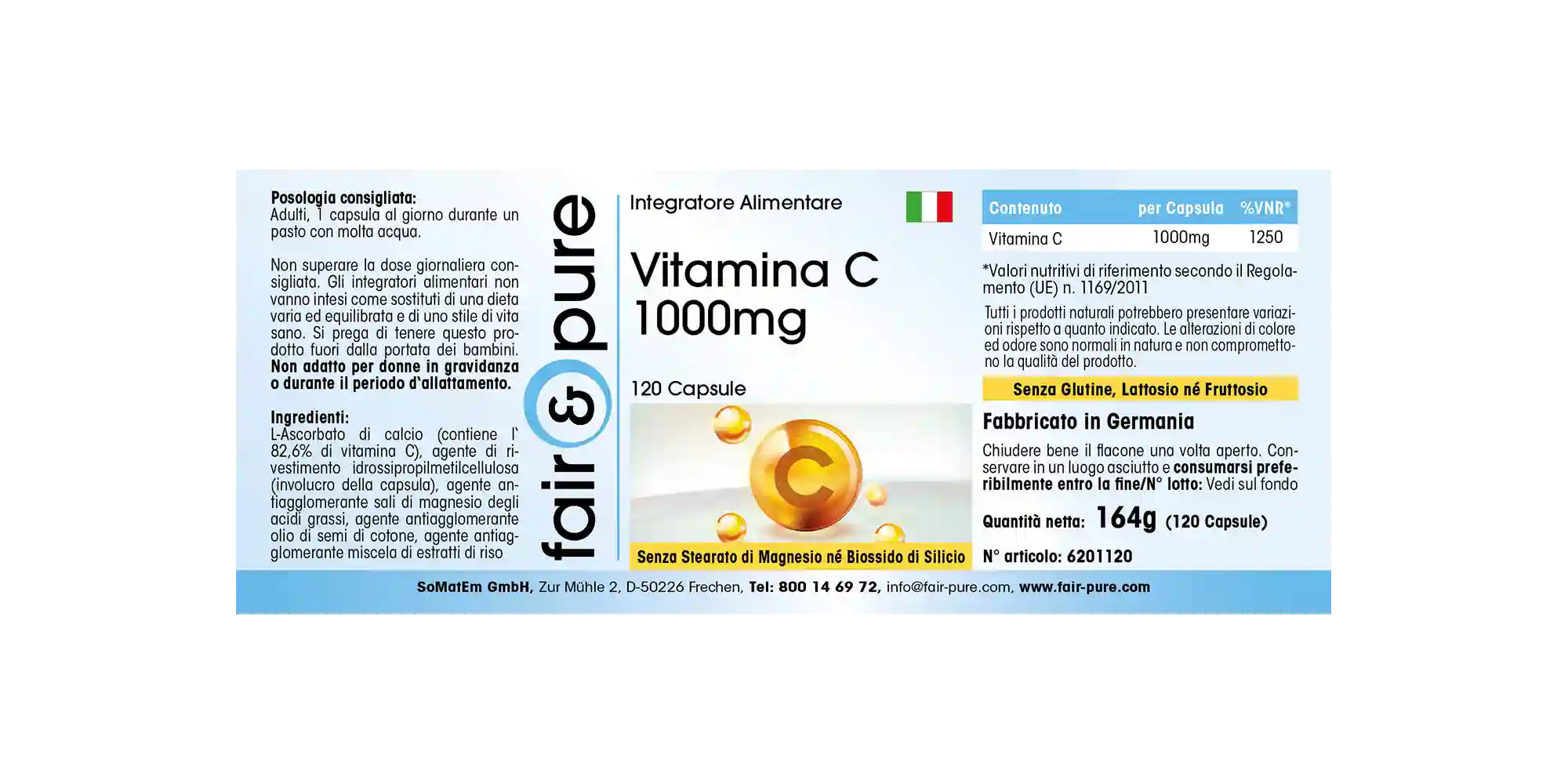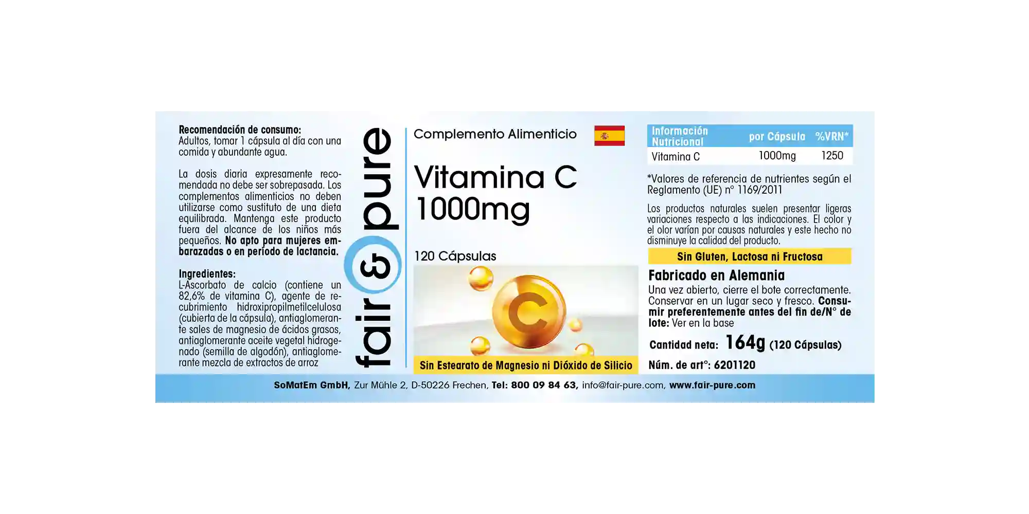 L-ascorbato de calcio (contiene un 82,6% de vitamina C), agente de recubrimiento hidroxipropilmetilcelulosa (cubierta de la cápsula), antiaglomerante sales de magnesio de ácidos grasos, antiaglomerante aceite vegetal hidrogenado (semilla de algodón), antiaglomerante mezcla de extractos de arroz.