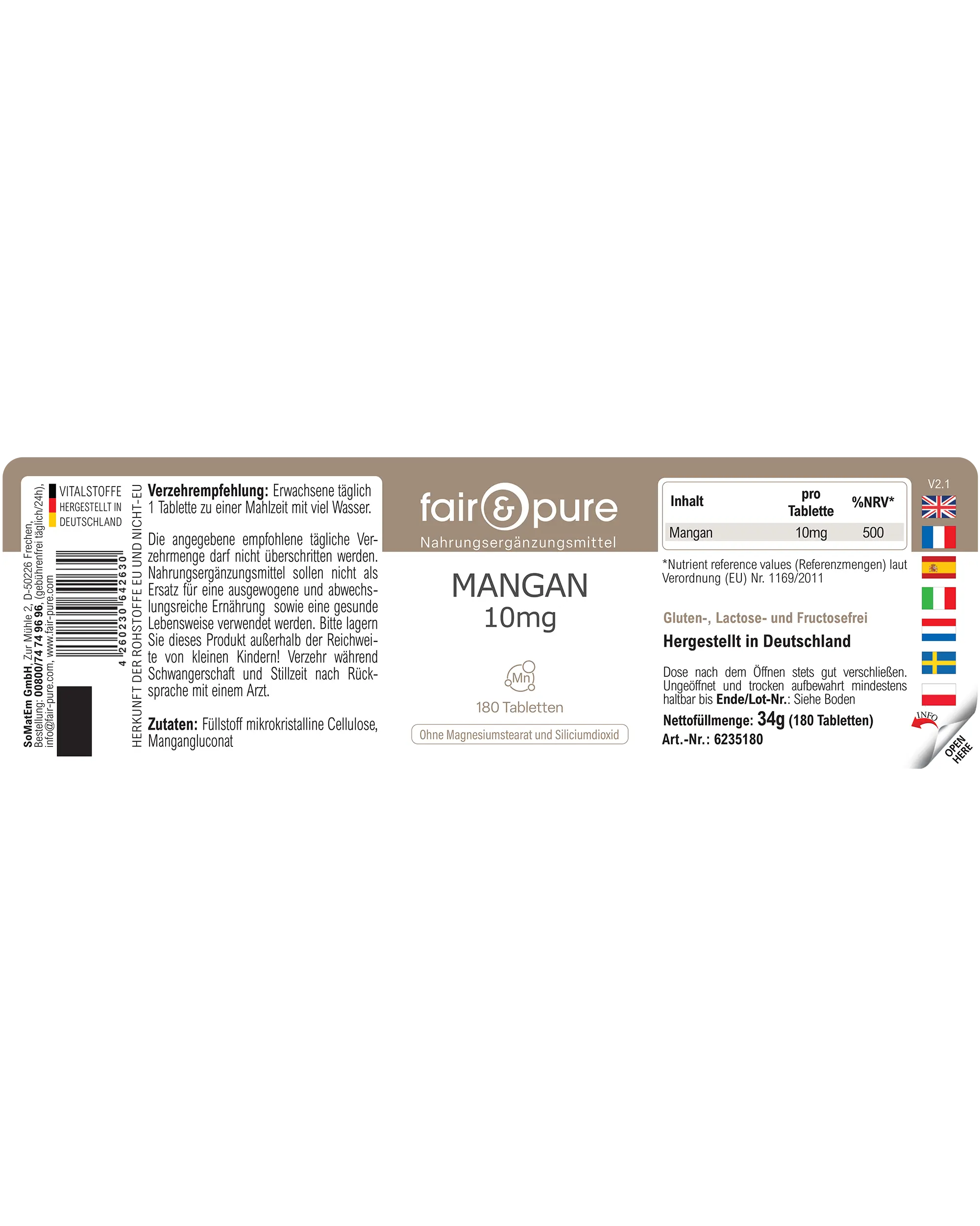 Manganese 10 mg di Fair & Pure contiene manganese di alta qualità sotto forma di gluconato di manganese. Il manganese è un oligoelemento essenziale presente naturalmente in molti alimenti e, in piccole quantità, è parte integrante di una dieta equilibrata.