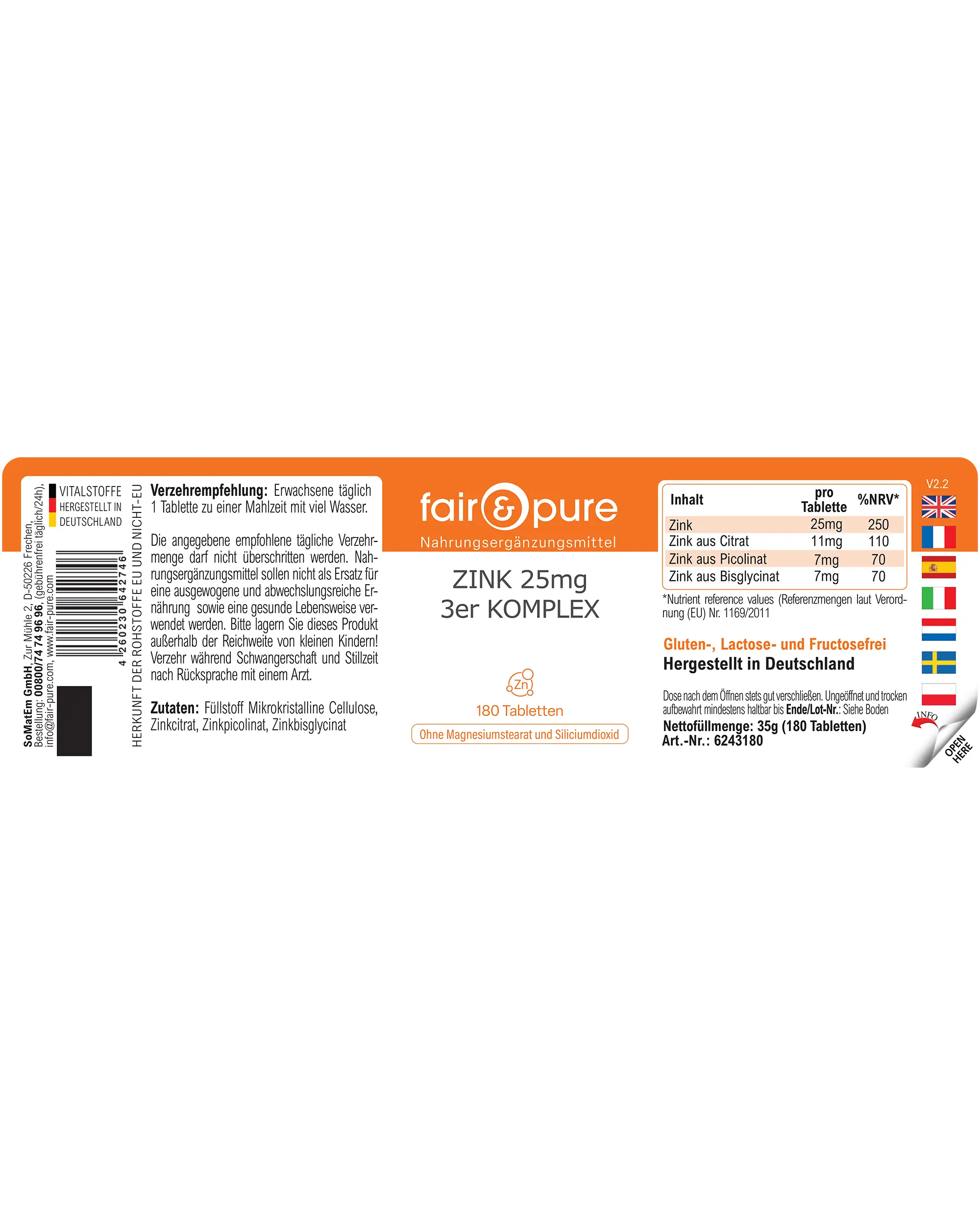 Produktinformationen "Zink 25mg 3er-Komplex - 180 Tabletten - schluckfreundlich - Immunsystem, Haut, Sehkraft uvm. - vegan | fair-pure"