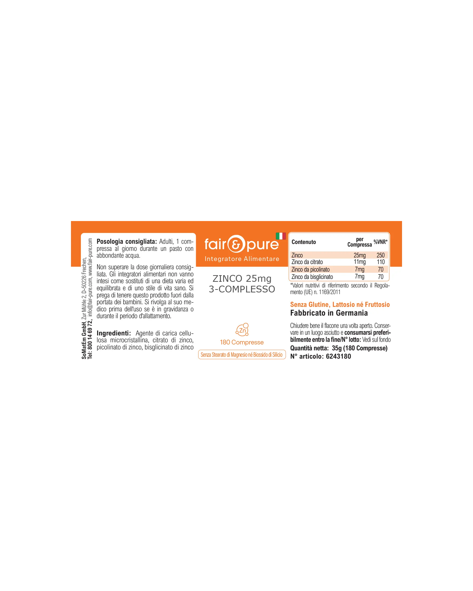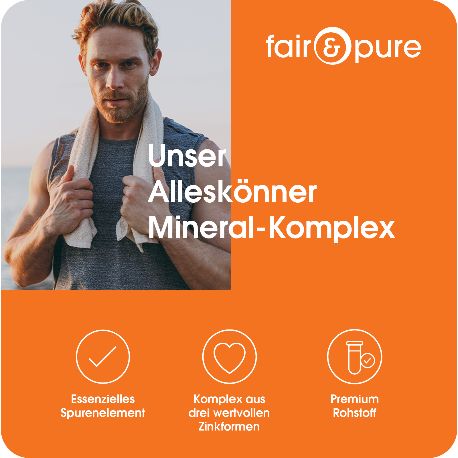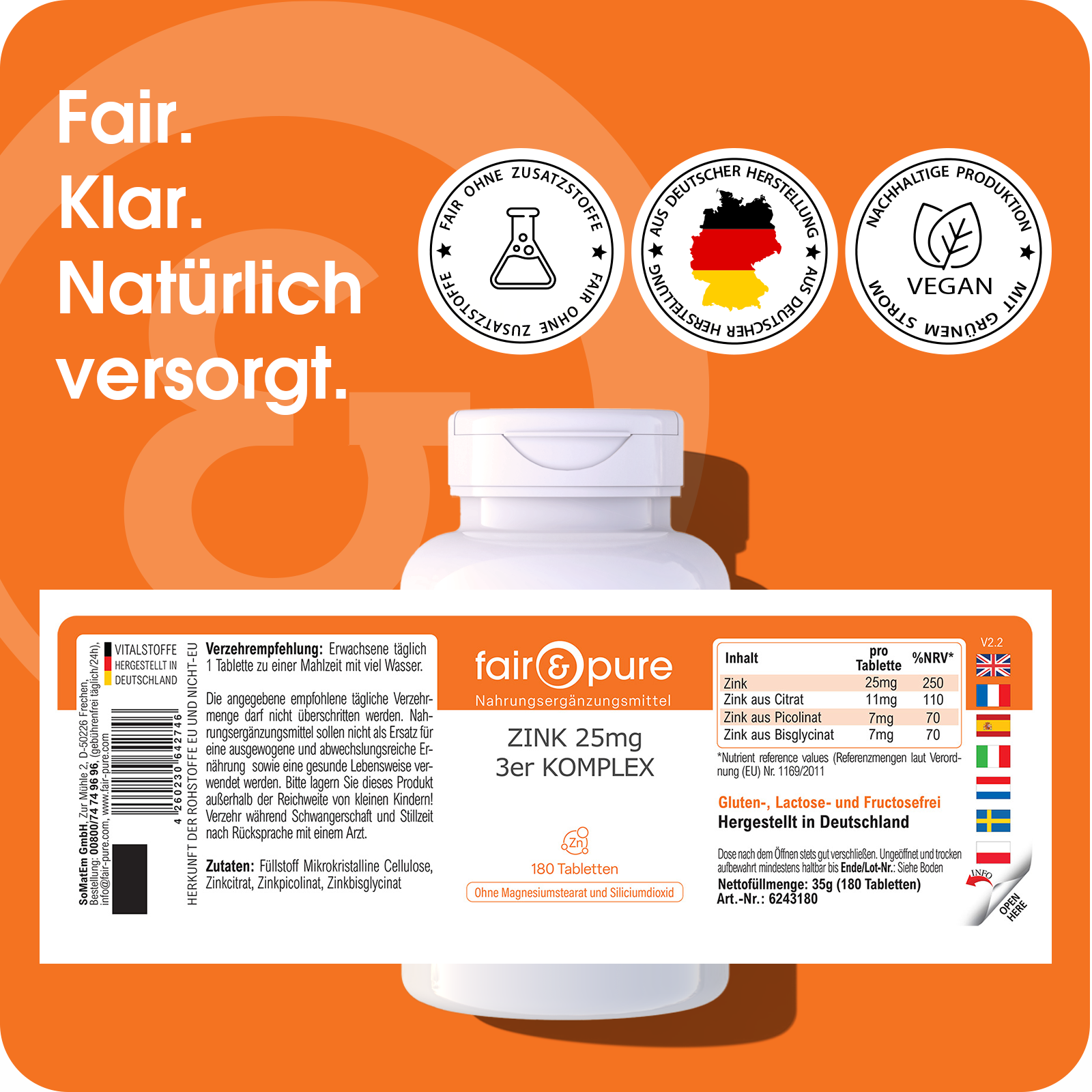 Zink 25mg 3er-Komplex - 180 Tabletten - schluckfreundlich - Immunsystem, Haut, Sehkraft uvm. - vegan | fair-pure