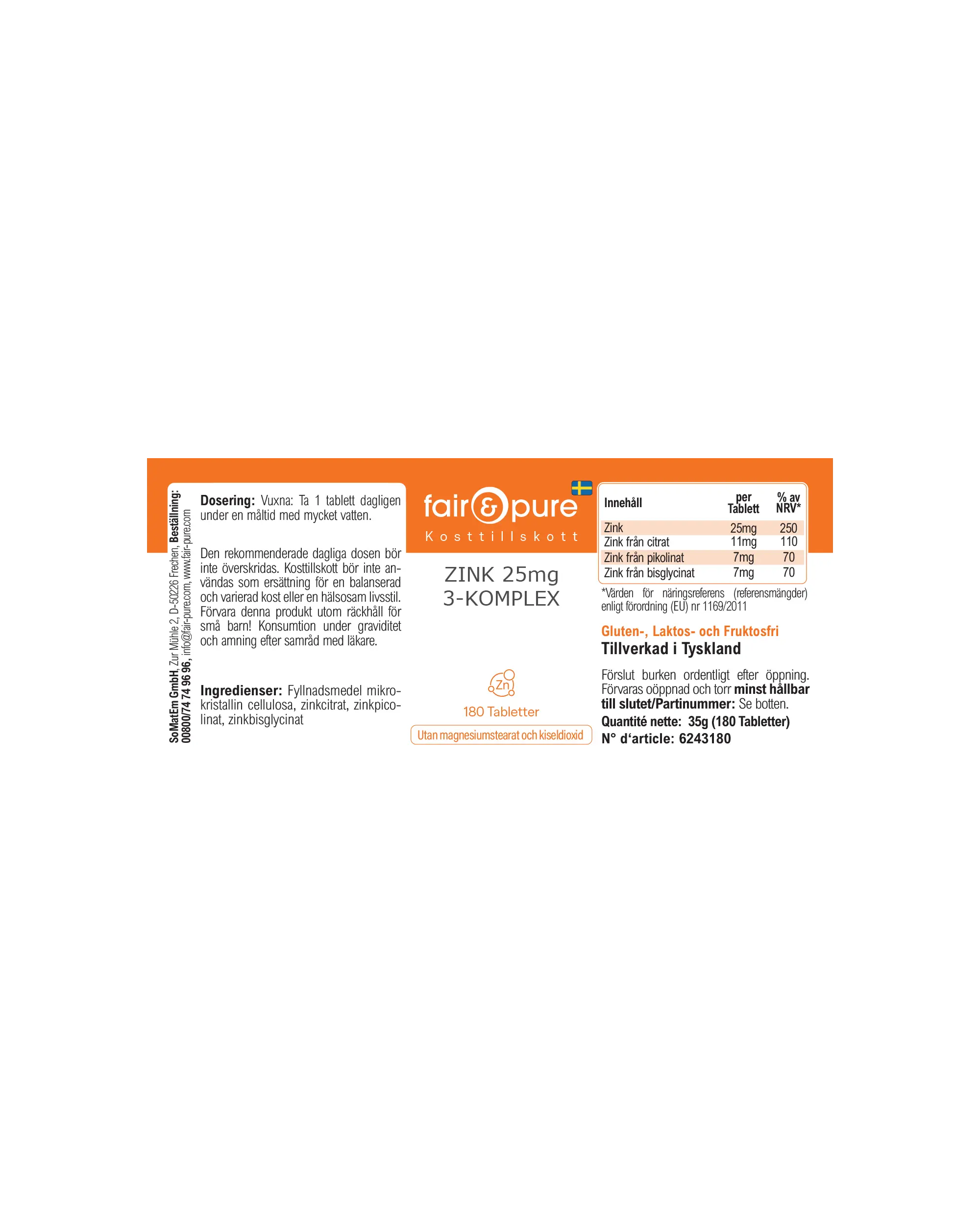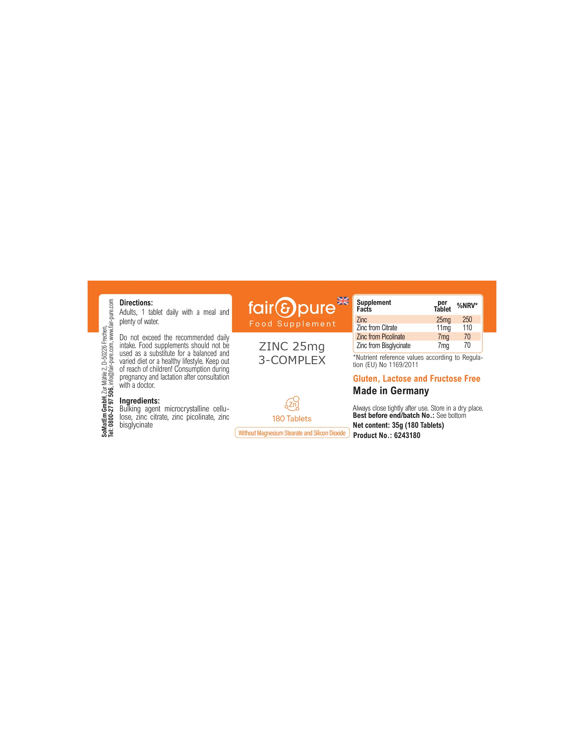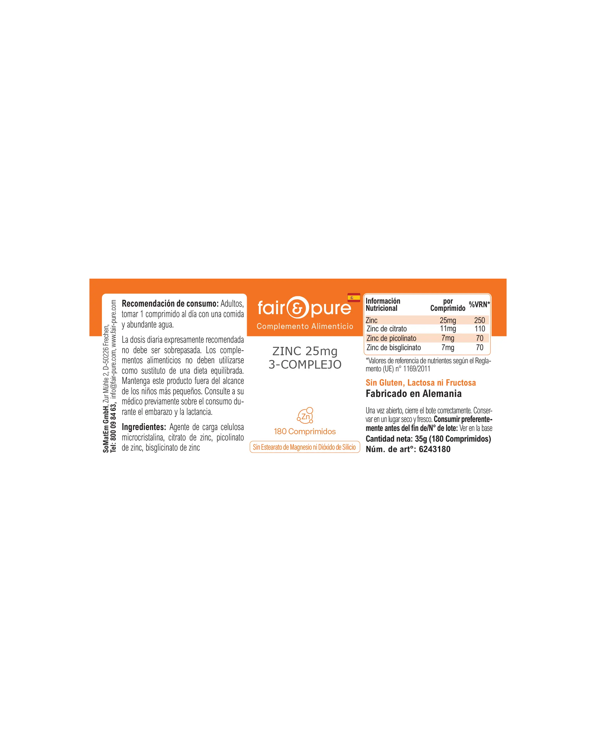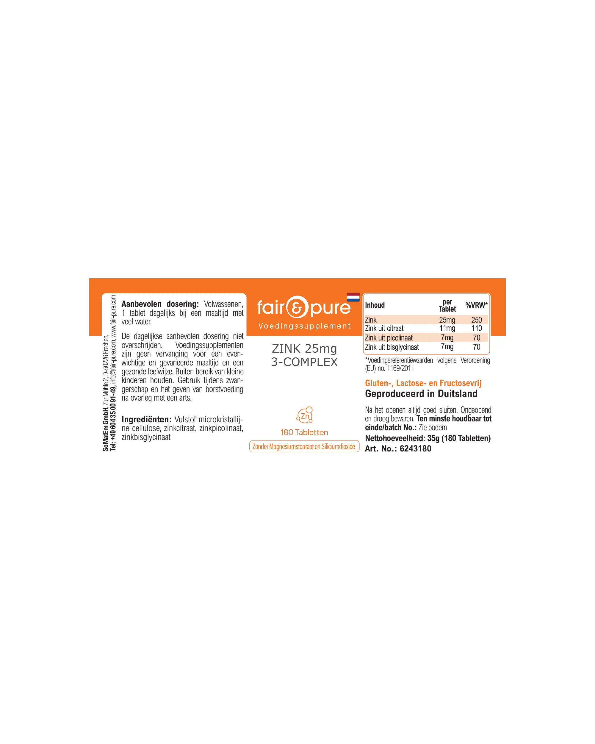 Zink 25mg 3er-Komplex - 180 Tabletten - schluckfreundlich - Immunsystem, Haut, Sehkraft uvm. - vegan | fair-pure