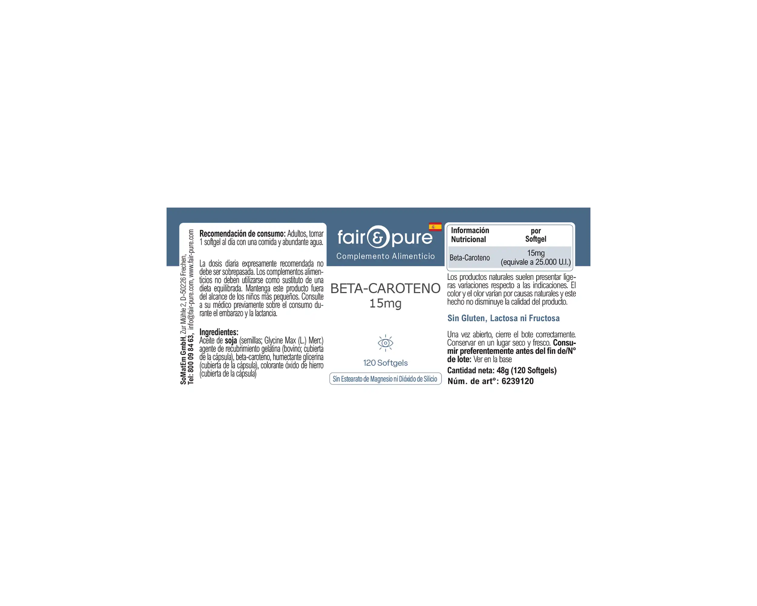 Beta-caroteno 15 mg de Fair & Pure contiene beta-caroteno de alta calidad en una forma de alta dosis. Con 15 mg de beta-caroteno por softgel, el producto aporta una cantidad concentrada de este carotenoide, conocido como precursor natural de la vitamina A. El beta-caroteno se encuentra de forma natural en muchos alimentos de origen vegetal y forma parte de una dieta equilibrada.