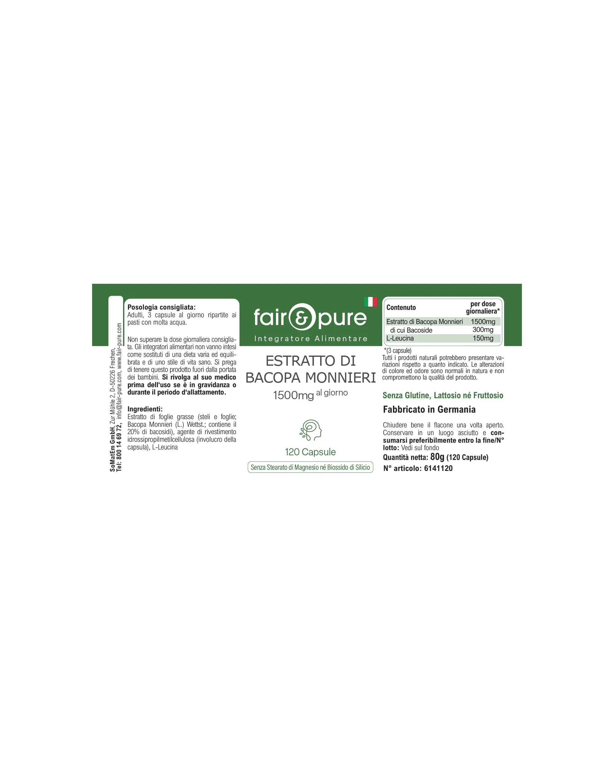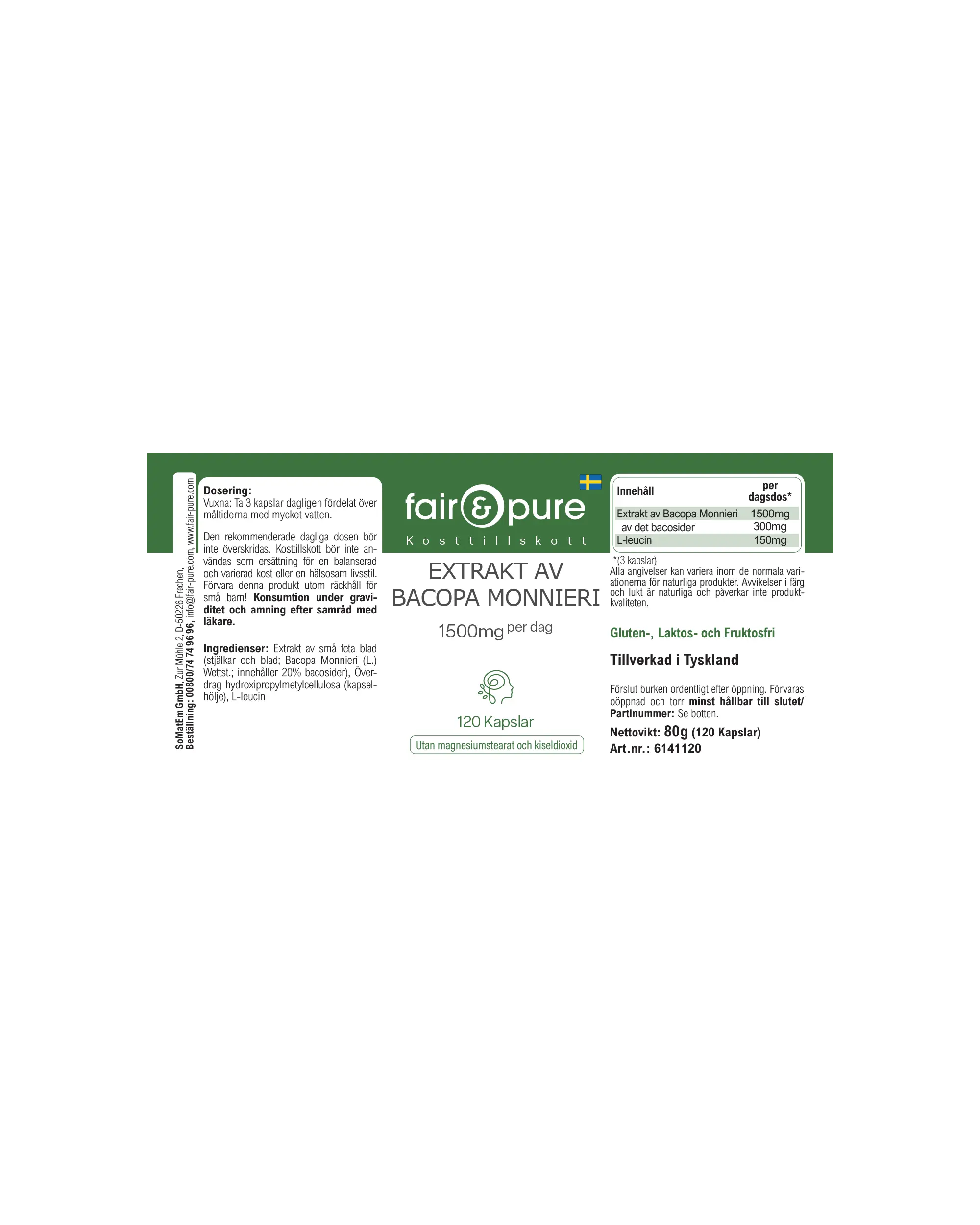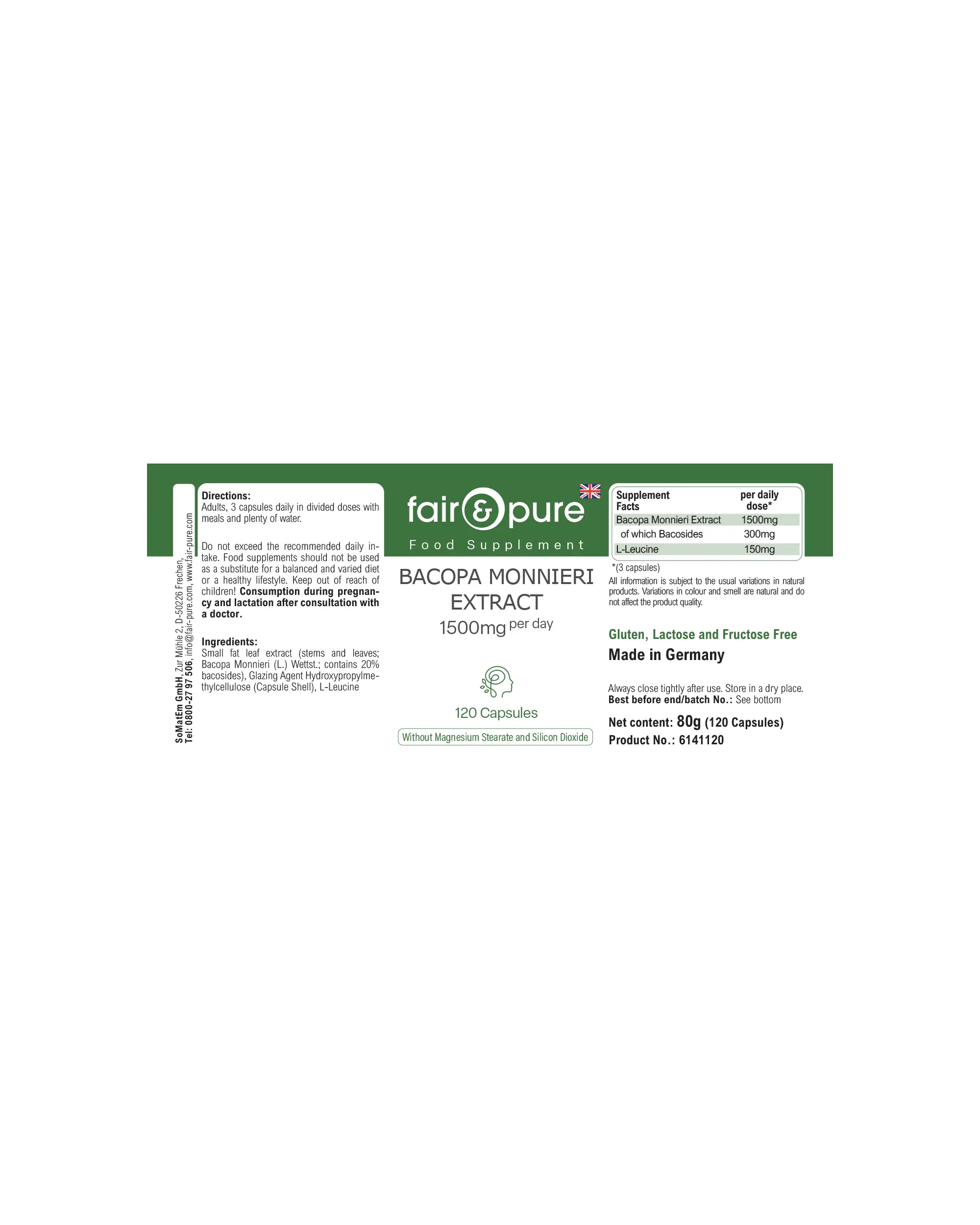 Extrait de petite feuille grasse (tiges et feuilles ; Bacopa Monnieri (L.) Wettst.; contient 20% de bacosides), agent d'enrobage hydroxypropylmethylcellulose (enveloppe de la gelule), L-LeucineRecommandation de consommation