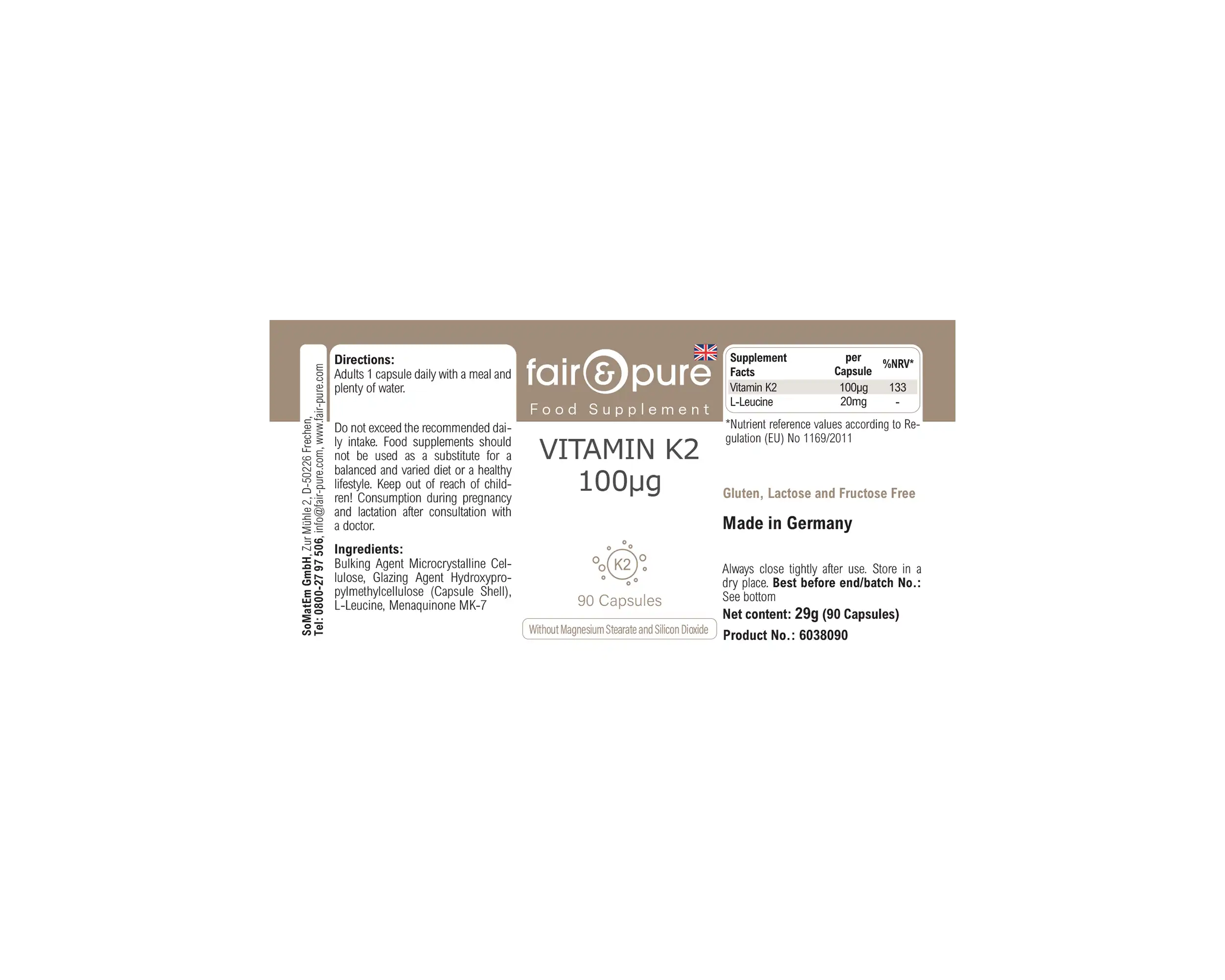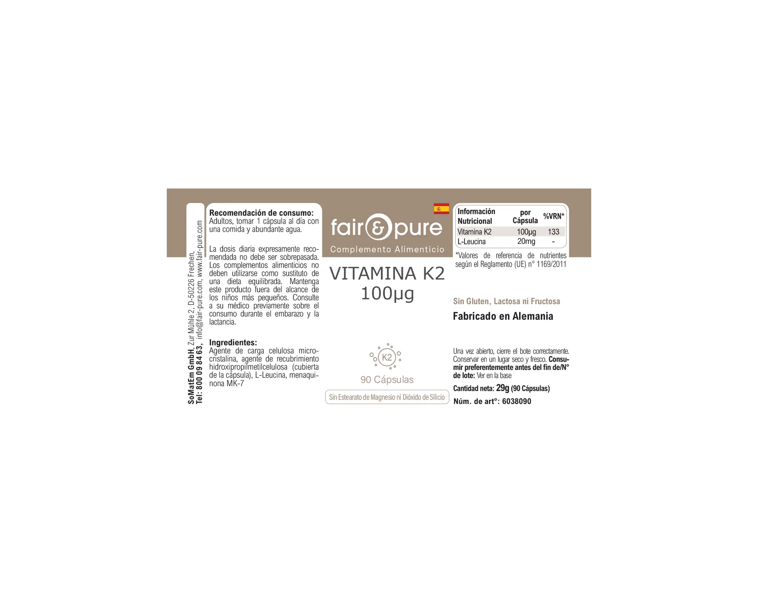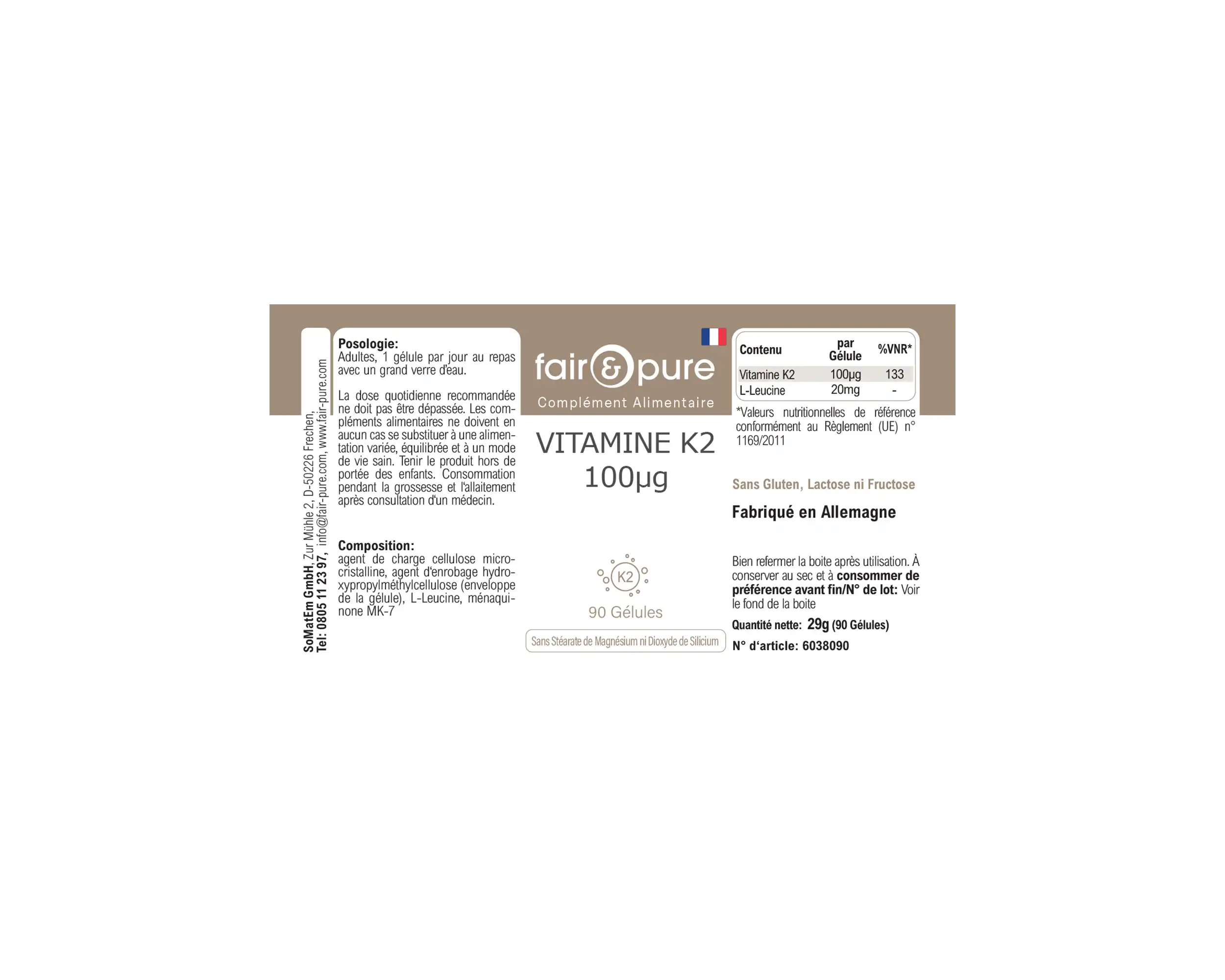 Agent de charge cellulose microcristalline, agent d'enrobage hydroxypropylméthylcellulose (enveloppe de la gélule), L-Leucine, ménaquinone MK-7, mélange d'extraits de riz