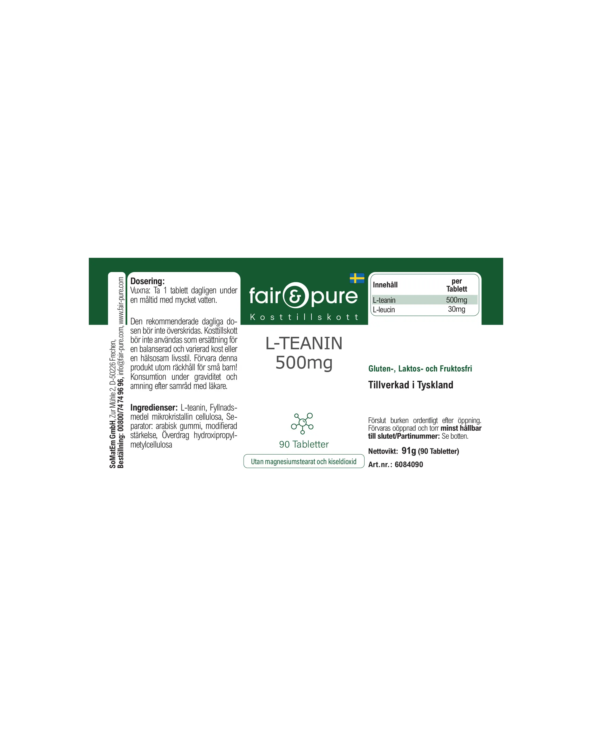 L-Teanina, agente di carica cellulosa microcristallina, Agenti antiagglomeranti: gomma arabica, amido modificato, Agente di rivestimento idrossipropilmetilcellulosa
